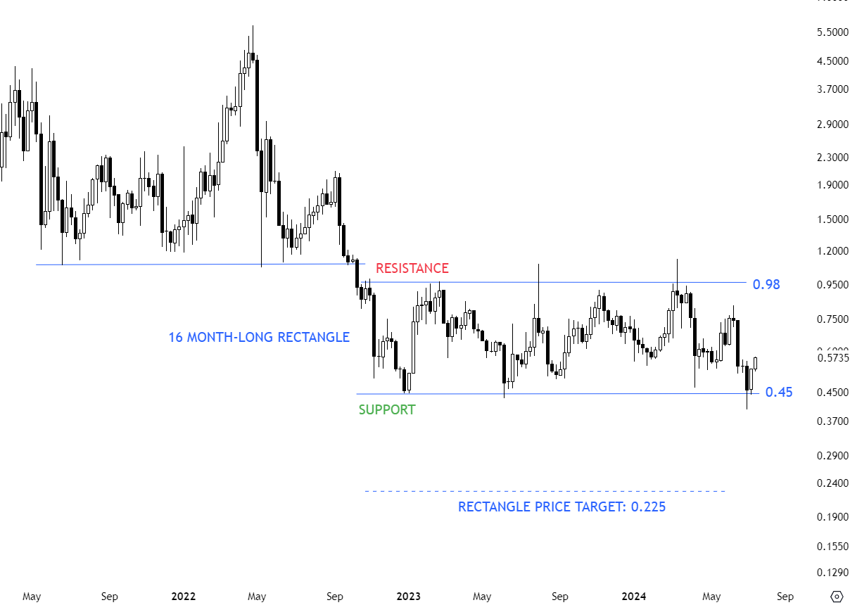 KNCUSD formed a well-defined consolidation range between 0.45 and 0.98 levels. Pattern can be identified as a rectangle. Given the existing downtrend, I have added the possible breakdown target as 0.225 levels. Both boundaries were tested several times and a breakout in any direction is expected to offer a directional movement. Breakdown below 0.45 levels can push price lower towards 0.225 levels. Until there is a breakdown on weekly scale the multi-month long consolidation offers trading opportunity between well-defined boundaries.