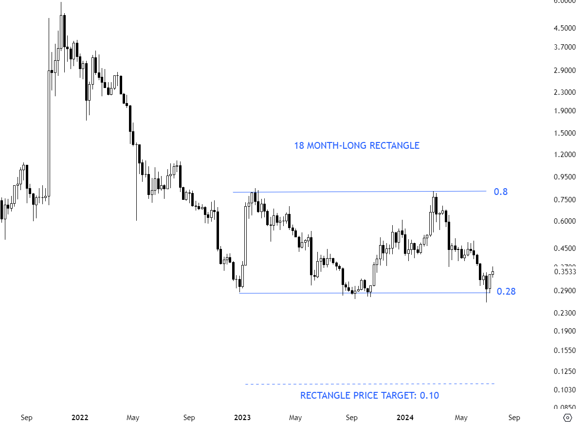 PIVXUSD might be forming a 14 month-long rectangle chart pattern with the upper boundary acting as a resistance at 0.54 levels. The upper boundary has been tested several times and it is well-defined. For now, the pair offers a trading opportunity between well-defined horizontal boundaries. A shorter-term rectangle completed with the breakdown below 0.267 levels. 0.267 levels is now acting as resistance. Price can target the horizontal support at 0.15 levels. Quick recovery above 0.267 levels can put the trading back to 0.267-0.54 range.