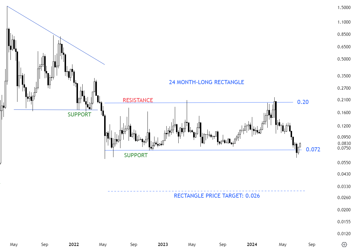 NKNUSD is another pair with a clean horizontal boundary with several tests. The support is at 0.072 levels. Breakdown can confirm the rectangle as a bearish continuation chart pattern with the price target of 0.026 levels. So far the pair is trying to rebound from the horizontal support and this can offer a trading opportunity between the boundaries.