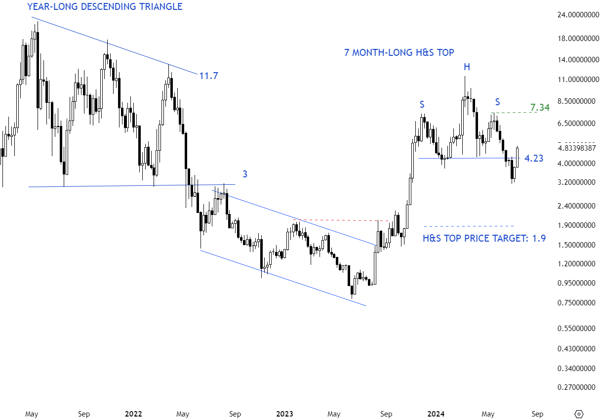 LINKUSD might be completing a 7 month-long H&S top with the horizontal neckline acting as support at 13 levels. The left and tight shoulders have symmetry in price and time. Breakdown below 13 levels (with a long black weekly candle), hasn’t confirmed the H&S top as we were looking for a weekly close at the lows of the weekly candle for breakdown confirmation. Pattern is not negated. H&S top failure can take place if price clears the high of the right shoulder with a strong weekly (long white) candle. Re-completion of the H&S top will require a long black weekly candle that closes below the neckline at 13 levels.