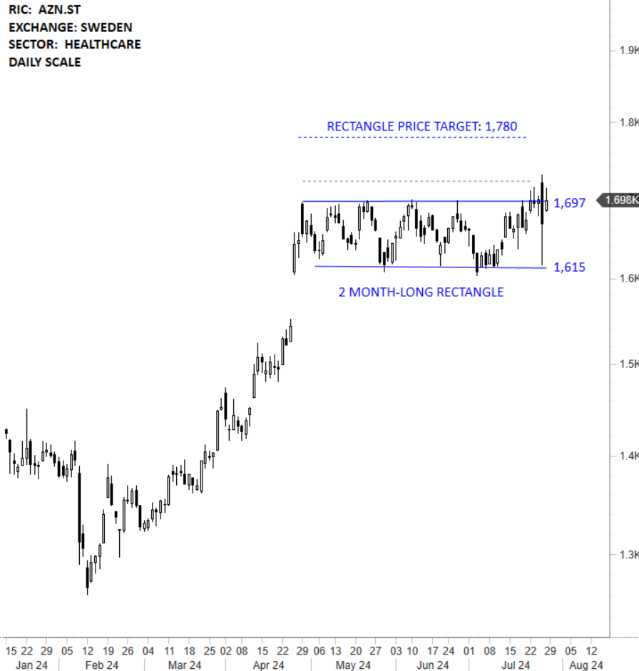 AstraZeneca PLC is a science-led biopharmaceutical company. It discovers, develops, and commercializes prescription medicines in oncology, rare diseases, and biopharmaceuticals, including cardiovascular, renal and metabolism, respiratory and immunology and vaccines and immune therapies. The stock is listed on the Stockholm Stock Exchange. Price chart formed a 2 month-long rectangle with the horizontal boundary acting as strong resistance at 1,697.00 levels. The horizontal boundary was tested several times over the course of the chart pattern. A daily close above 1,722.00 levels will confirm the breakout from the 2 month-long rectangle with the possible chart pattern price target of 1,780.00 levels. (Learn more: Video Tutorial)