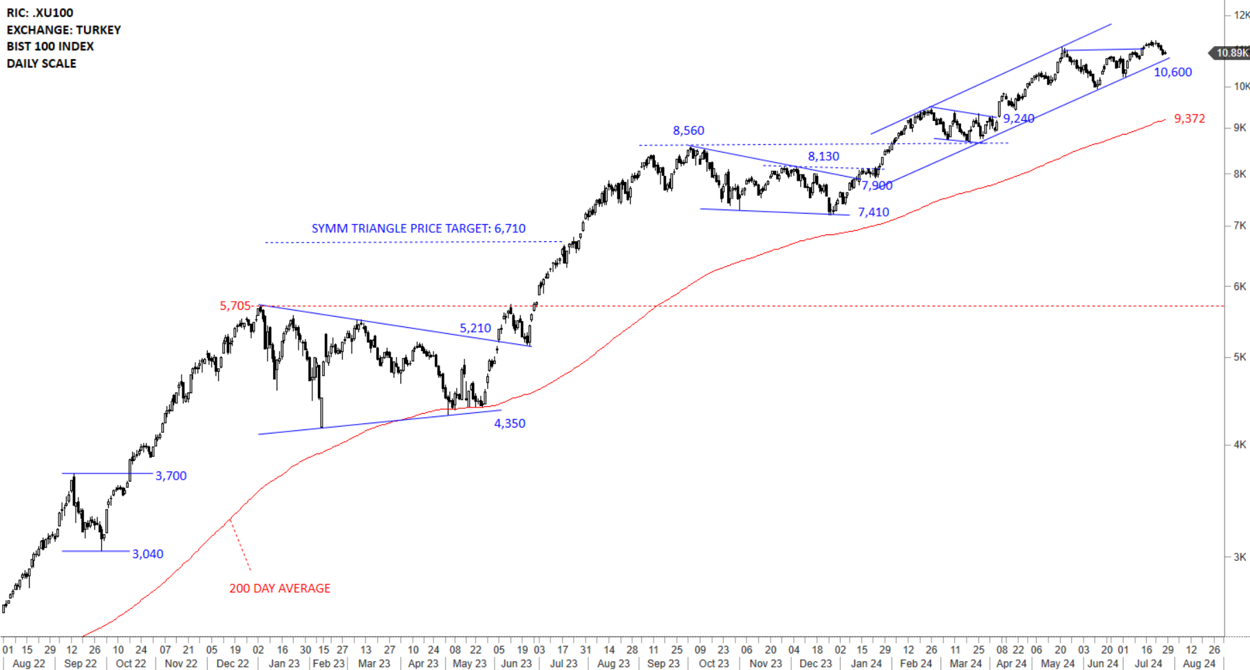 BIST 100 equity benchmark continues to remain above the upper boundary of the rising trend channel. Usually price action above the upper boundary of a rising trend channel suggest strong trend. The 200-day moving average acted as a long-term support now standing at 9,372 levels. Uptrend is intact.