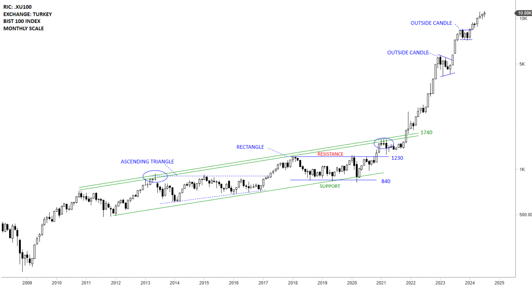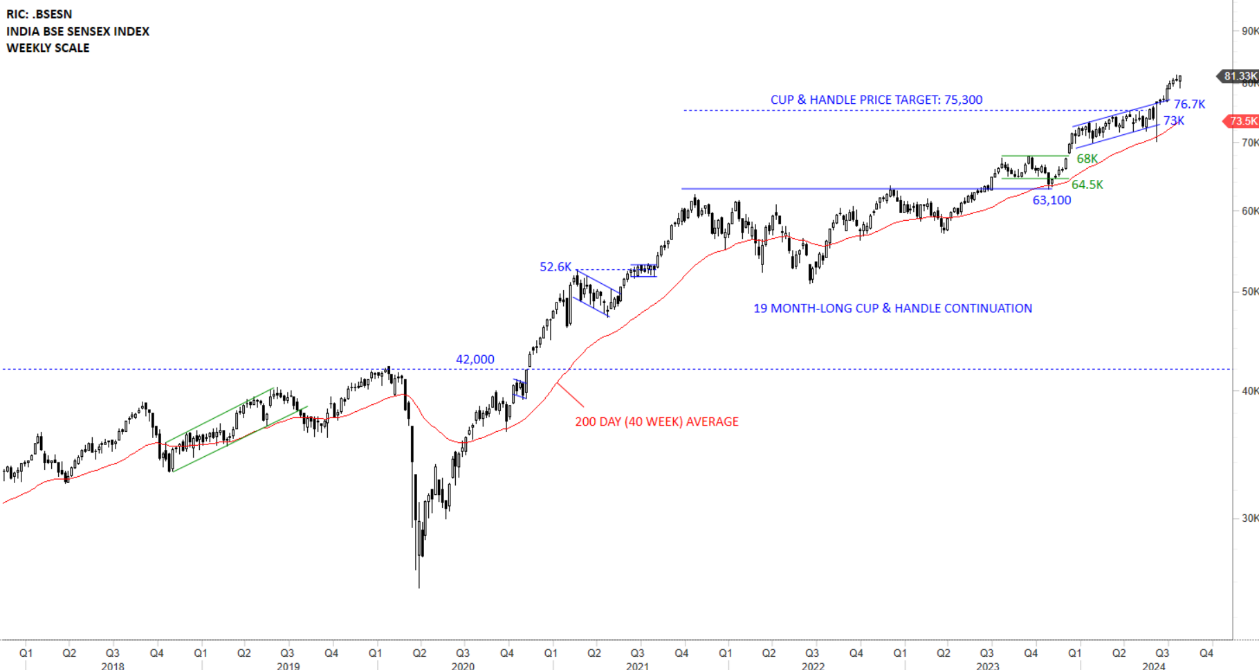 Both Nifty 50 and Sensex completed multi-month long cup & handle continuation chart patterns. The horizontal support for Nifty 50 stands at 18,690 levels and for Sensex it is at 63,100 levels. Cup & handle continuation price targets for Nifty 50 and for Sensex were met. Previous horizontal resistances become the new support. I will continue to view India equities in a steady uptrend as long as they remain above their strong support levels and the 200-day averages. Last few month’s price action on both benchmarks formed upward trend channels that were breached on the upside, accelerating the uptrends. Such price action can be followed by a rally as price clears the positive extreme in an uptrend. The upper boundary of the channel becomes the new short-term support for both indices. For Nifty 50 the short term support stands at 23.3K and for Sensex it is at 76.7K.