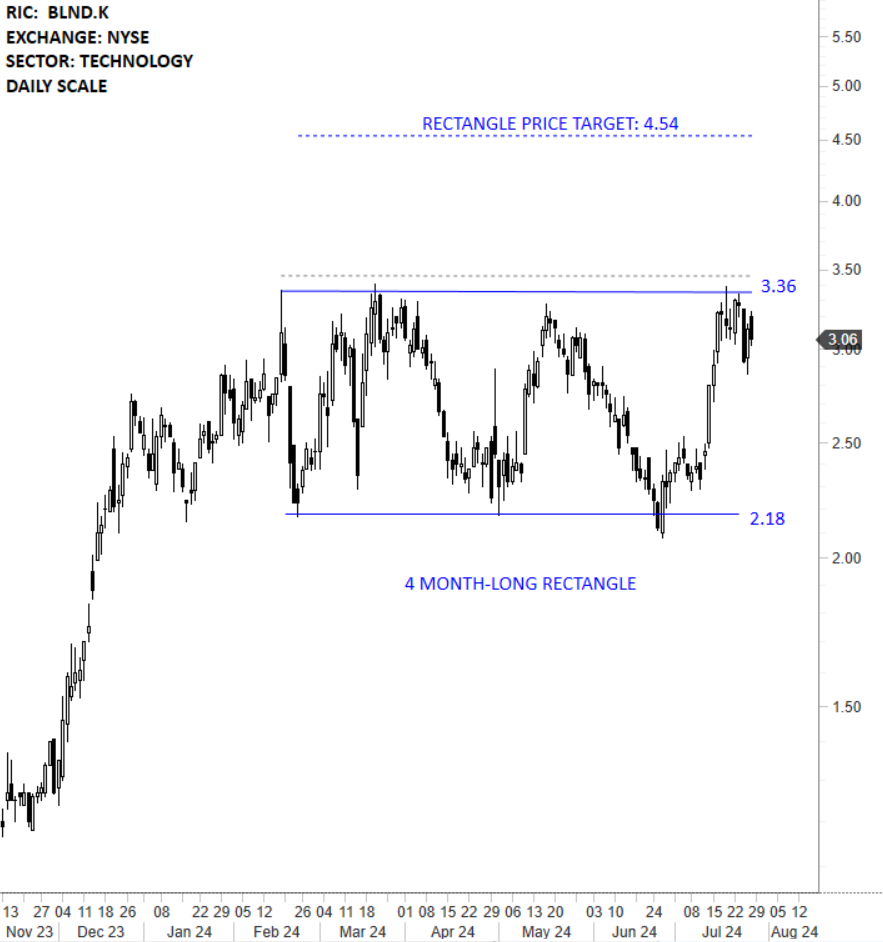 Blend Labs, Inc. provides a cloud-based software platform and a suite of products for financial providers to transform consumer banking experiences and streamline workflows for their teams. The stock is listed on the New York Stock Exchange. Price chart formed a 4 month-long rectangle with the horizontal boundary acting as strong resistance at 3.36 levels. The horizontal boundary was tested several times over the course of the chart pattern. A daily close above 3.46 levels will confirm the breakout from the 4 month-long rectangle with the possible chart pattern price target of 4.54 levels. (Learn more: Video Tutorial)