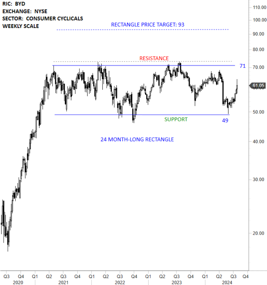 Boyd Gaming Corporation is a gaming company, which is a diversified operator of 28 gaming entertainment properties in 10 states. The stock is listed on the New York Stock Exchange. Price chart formed a 24 month-long rectangle with the horizontal boundary acting as strong resistance at 71.00 levels. The horizontal boundary was tested several times over the course of the chart pattern. A daily close above 73.15 levels will confirm the breakout from the 24 month-long rectangle with the possible chart pattern price target of 93.00 levels. The stock offers trading opportunity between the well-defined boundaries. (Learn more: Video Tutorial)