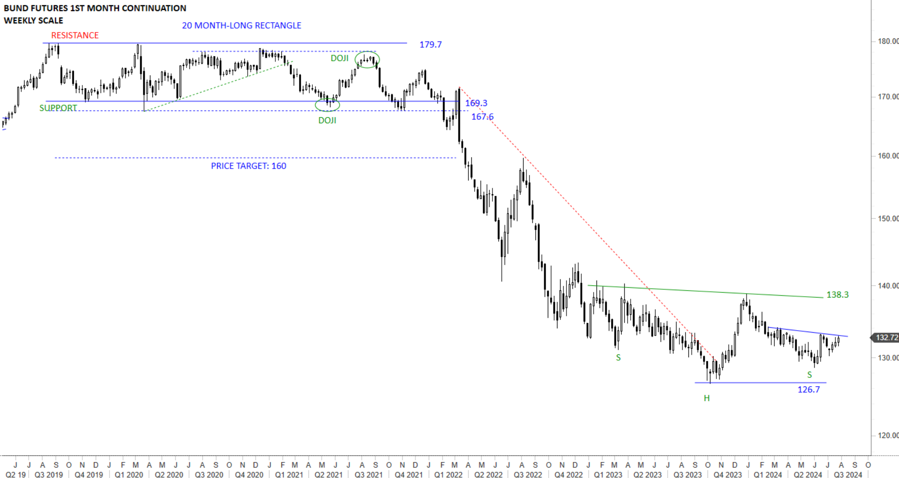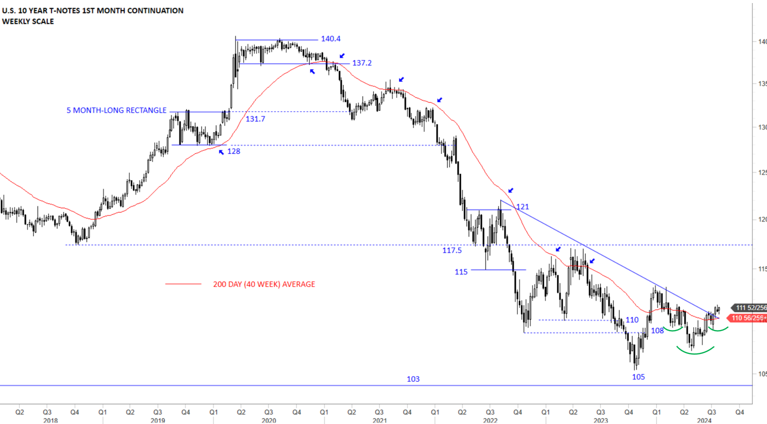 The U.S. 10 year T-Notes is trying to recover and stabilize above the 200-day average. A possible short-term H&S bottom reversal can be seen on weekly scale charts. Recovery above 200-day average around 111 levels changed the outlook to positive in the short-term. Both the downward sloping trend line and the 200-day average are forming resistance around the same level. This month’s breach of the downtrend line can be the beginning of a trend reversal. Breach of the trendline also cleared the possible neckline of the H&S bottom. It is important for the price to accelerate away from the trend line with long weekly candles.