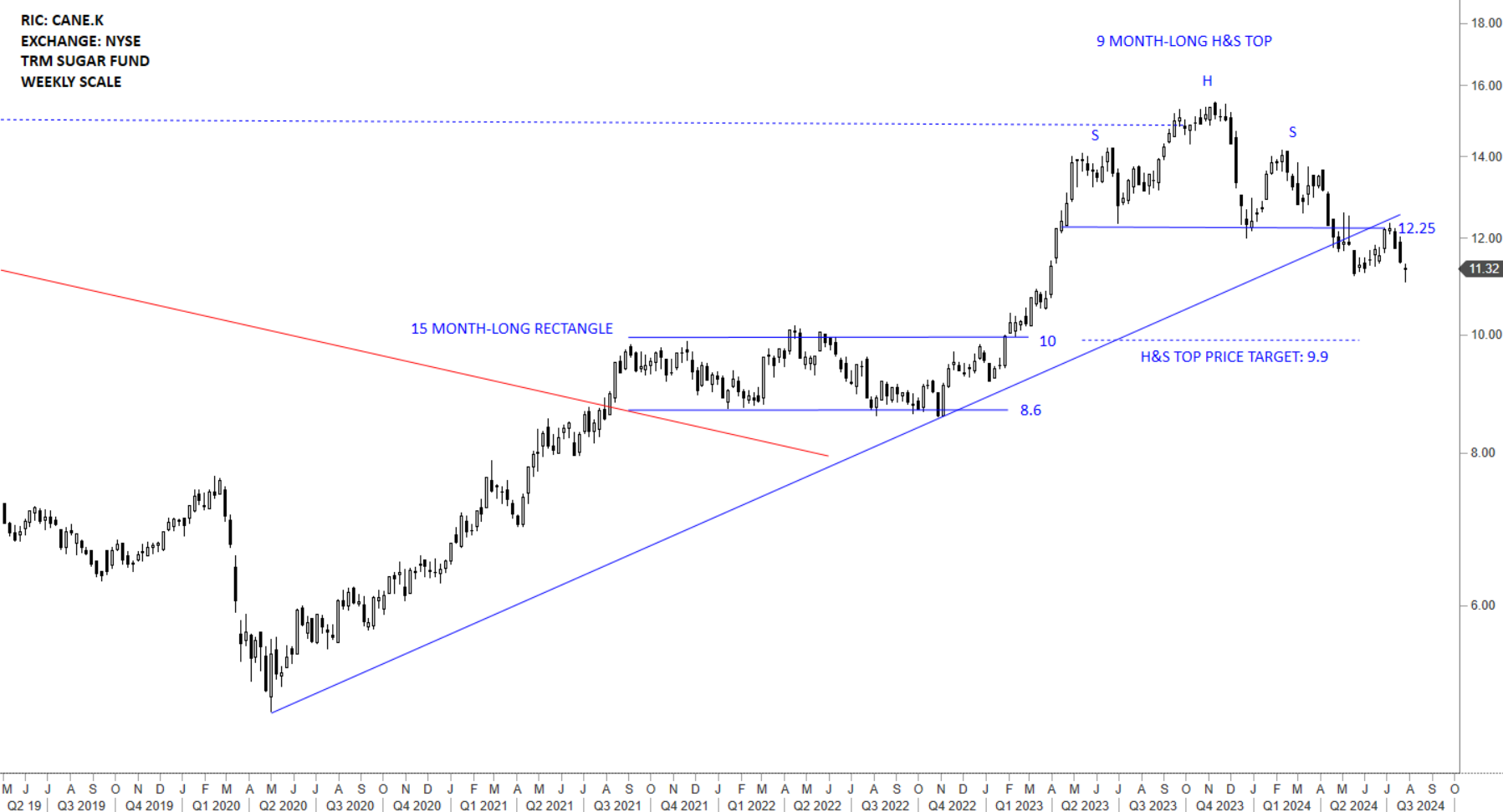 Once again a sweet opportunity might be developing on Sugar ETF CANE with the possible 9 month-long H&S top reversal. This is a text-book H&S top reversal with symmetry between shoulders and a horizontal neckline at 12.25 levels. Breakdown targets the previous rectangle chart pattern upper boundary at 10 levels as support. The neckline which acted as support at 12.25 levels turns into a resistance. Price can resume towards pattern objective in the following weeks.