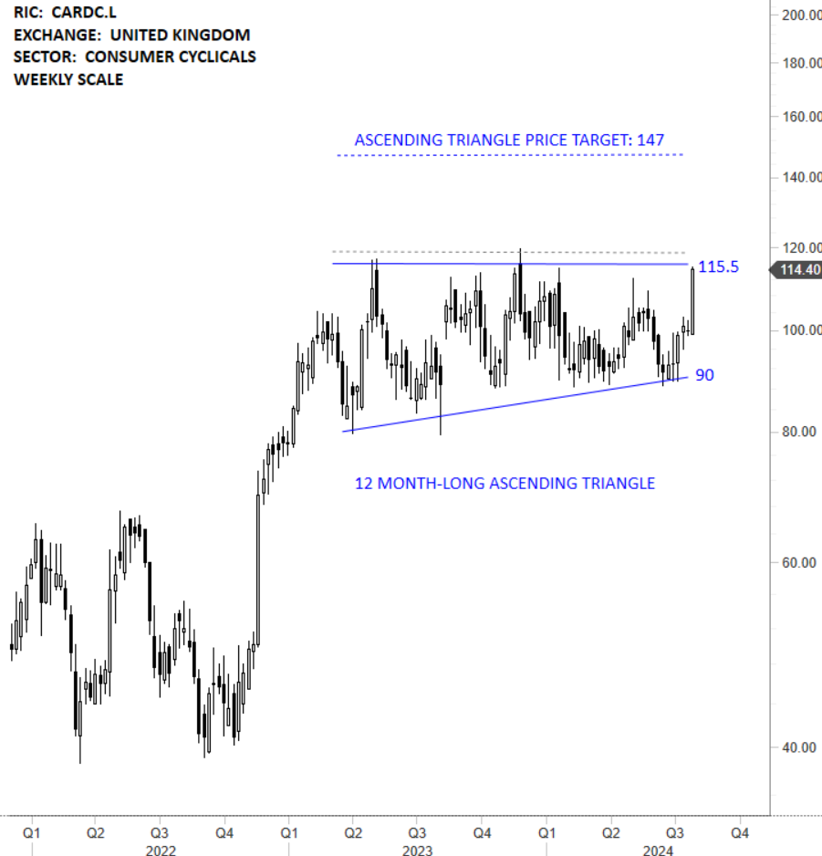 Card Factory plc is a United Kingdom-based specialist retailer of greeting cards, dressings and gifts. The stock is listed on the London Stock Exchange. Price chart formed a 12 month-long ascending triangle with the horizontal boundary acting as strong resistance at 115.50 levels. The horizontal boundary was tested several times over the course of the chart pattern. A daily close above 119.00 levels will confirm the breakout from the 12 month-long ascending triangle with the possible chart pattern price target of 147.00 levels. (Learn more: Video Tutorial)
