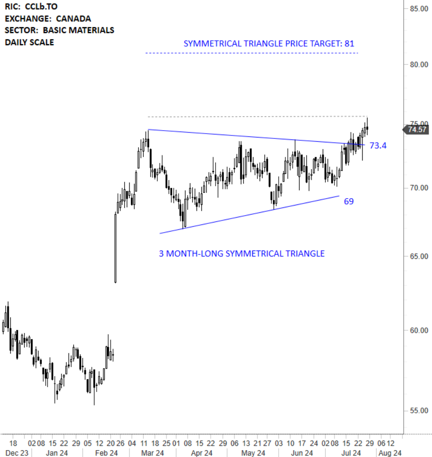 CCL Industries Inc. is a Canada-based company, which provides specialty label, security, and packaging solutions. The Company provides its solutions to global corporations, government institutions, small businesses, and consumers. The stock is listed on the Toronto Stock Exchange. Price chart formed a 3 month-long symmetrical triangle with the upper boundary acting as strong resistance at 73.40 levels. Both boundaries were tested several times over the course of the chart pattern. A daily close above 75.60 levels will confirm the breakout from the 3 month-long symmetrical triangle with the possible chart pattern price target of 81.00 levels. (Learn more: Video Tutorial)