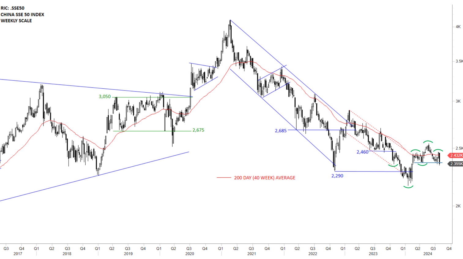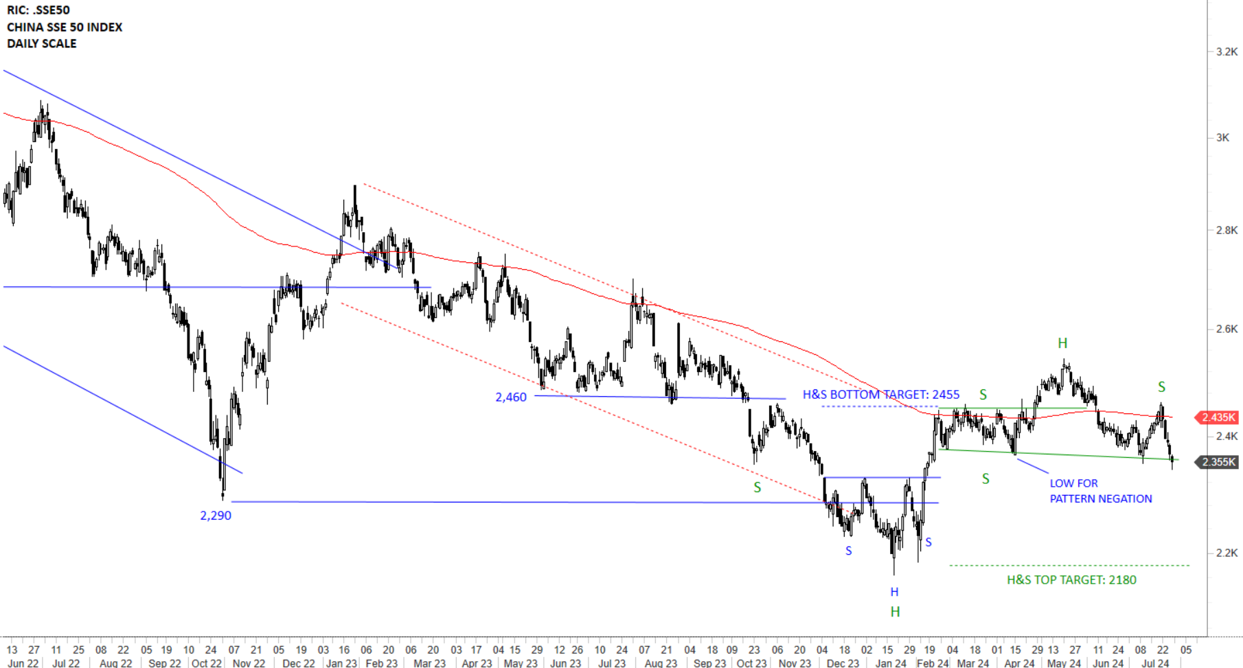 China SSE 50 Index has been in a steady downtrend over the past several years. Past one year’s price action is showing a well-defined downward sloping channel that broke out on the upside. The index is consolidating around its 200-day average and looking for direction. Though, the signals are mixed with two different H&S patterns forming around the same level and not offering any clear direction at this point. With this week’s reversal back below the 200-day average, possibility of a short-term H&S top emerged.