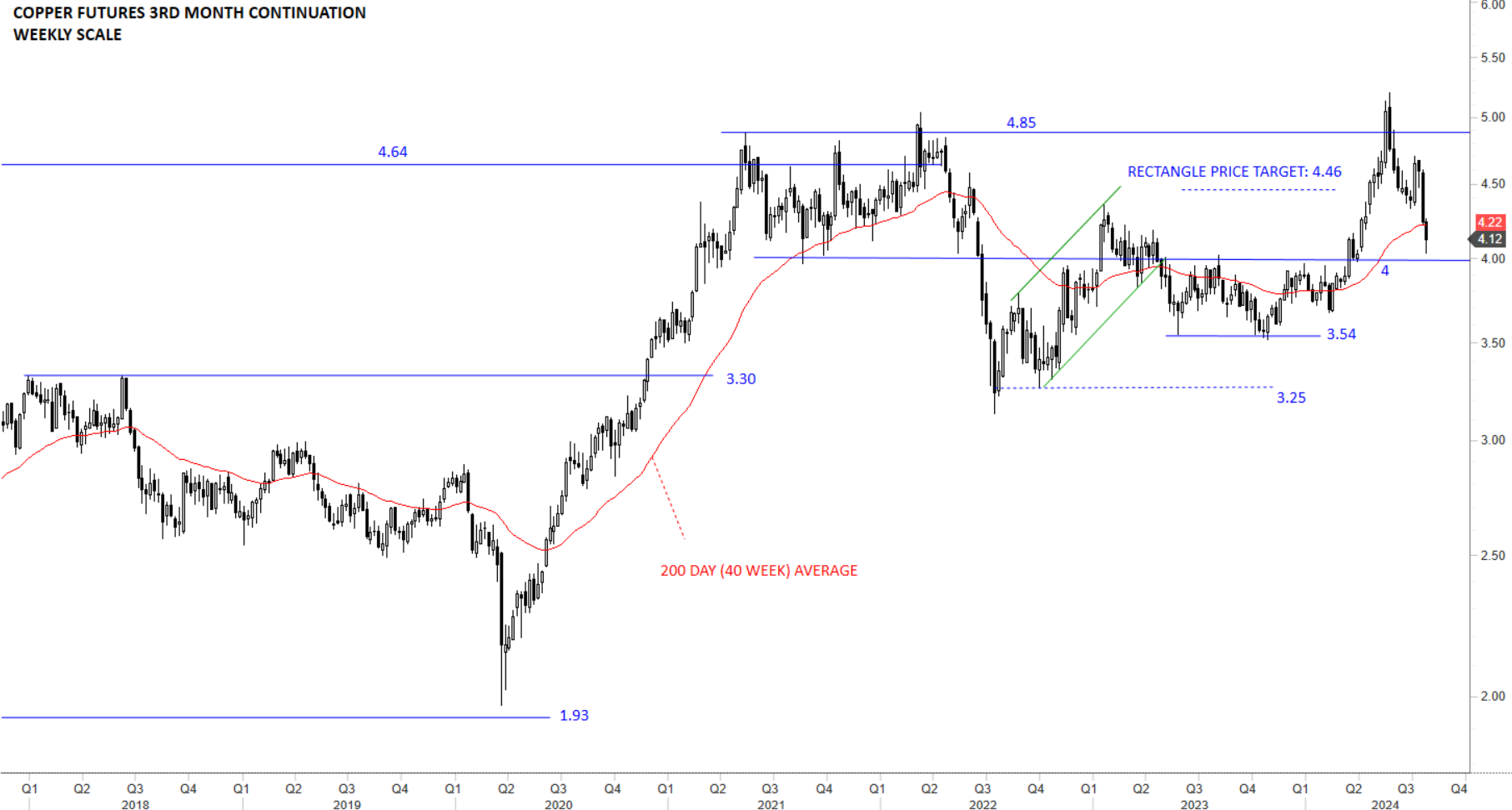 Copper has been in a sideways consolidation range which has become better defined between 3.54 and 4 levels. Breakout above 4 levels put Copper on a positive outlook. Uptrend resumed towards the rectangle price target at 4.46 levels and exceeded to clear the resistance at 4.85 levels. Price failed to hold above the 4.85 horizontal resistance. Failure to quickly recover above 4.85 levels confirmed the breakout above 4.85 as failure. Failure to hold above the year-long average at 4.22 levels resulted in a deeper correction towards the horizontal support at 4 levels. I will monitor price to see if it will find support at 4 levels and recover above the year-long average at 4.22 levels.