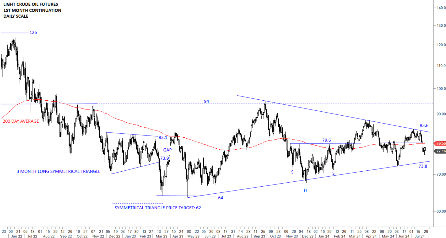 Crude Oil is looking for direction in a wide trading range between 64 and 94. Price continues to breach the 200-day average in both directions. Chart pattern is morphing. Possible long-term symmetrical triangle might be developing with the upper boundary acting as resistance at 83.6 and the lower boundary as support at 73.8 levels.