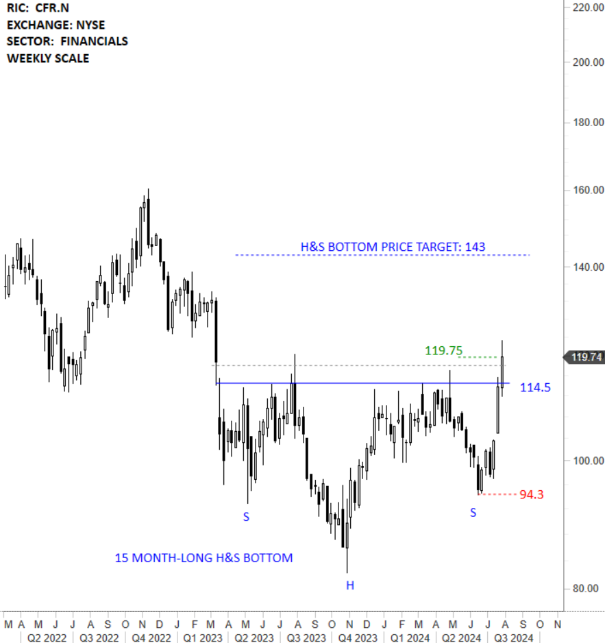 Cullen/Frost Bankers, Inc. is a financial holding and bank holding company. The Company’s segments include Banking and Frost Wealth Advisors. The stock is listed on the New York Stock Exchange. Price chart formed a 15 month-long head and shoulder bottom with the horizontal boundary acting as strong resistance at 114.50 levels. The horizontal boundary was tested several times over the course of the chart pattern. The daily close above 118.00 levels confirmed the breakout from the 15 month-long head and shoulder bottom with the possible chart pattern price target of 143.00 levels. (Learn more: Video Tutorial)
