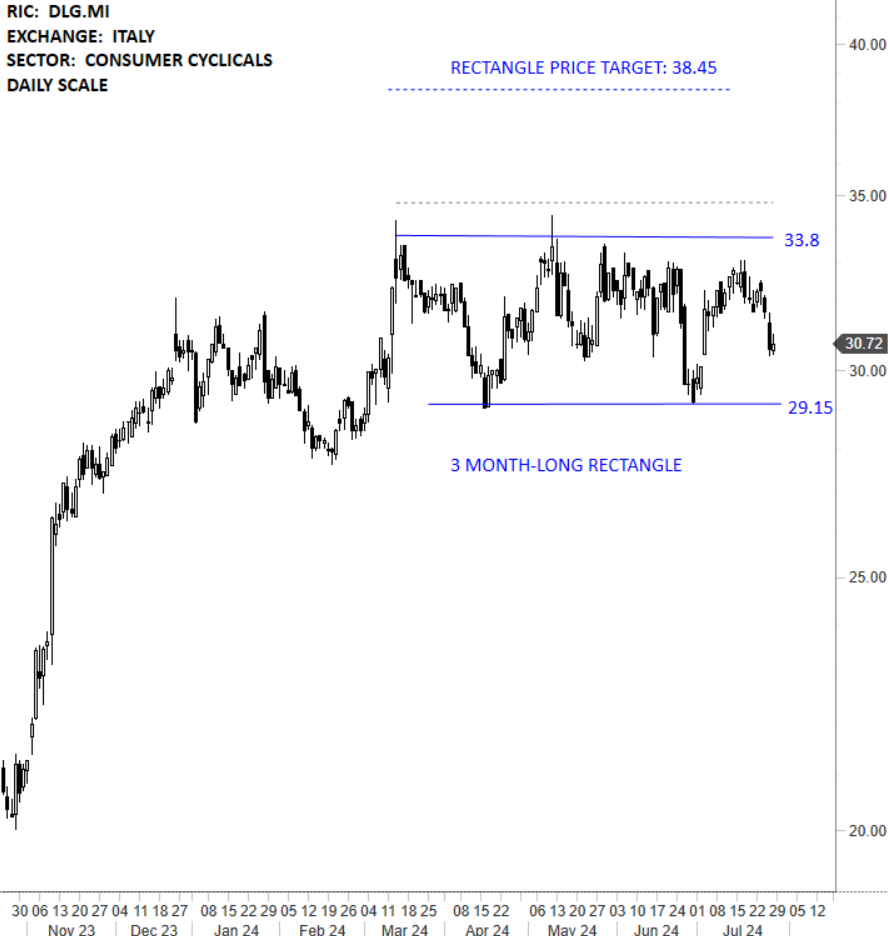 De’ Longhi SpA is an Italy-based company which designs, produces and markets products for home and business comfort. The stock is listed on the Milan Stock Exchange. Price chart formed a 3 month-long rectangle with the horizontal boundary acting as strong resistance at 33.80 levels. The horizontal boundary was tested several times over the course of the chart pattern. A daily close above 34.80 levels will confirm the breakout from the 3 month-long rectangle with the possible chart pattern price target of 38.45 levels. (Learn more: Video Tutorial)