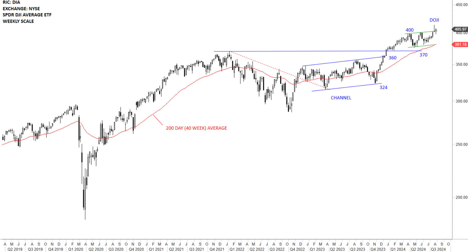 DIA broke out of an upward channel with the upper boundary at 360 levels. Such price action is usually followed by a rally. The ETF is strong and above its 200-day average. I start analyzing DIA ETF with bullish perspective above its 200-day average. The ETF possibly completed its pullback to strong support area formed by the horizontal boundary and the 200-day average at 382 levels. Uptrend can resume. Last week’s volatile price action cleared the consolidation between 370 and 400 levels though the weekly close was at the upper boundary, not a decisive breakout signal. The “doji” (long upper shadow) shows that the buyers were not strong enough to clear the resistance and keep the price higher. This week was relatively strong closing above the upper boundary of the recent consolidation. Jury is out and the following week we will need to monitor price chart for more evidence. A strong weekly close (long white candle) is required for trend acceleration. Failure to hold above 400 levels can result in further consolidation above the year-long average.