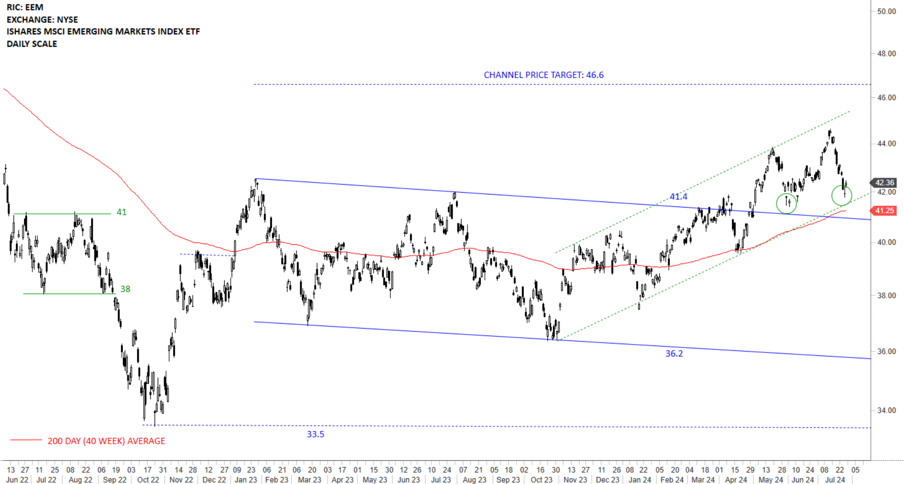 The benchmark for the Emerging Markets performance, the iShares MSCI Emerging Markets Index ETF (EEM) broke out of its channel at 41.4 levels. Following the breakout the ETF completed a pullback towards the upper boundary. Previous resistance becomes the new support. Strong support is at 41.25 levels. Since November 2023, price chart shows an upward trend channel with the lower boundary and the 200-day average overlapping and forming support around the same level at 41.25 levels. Uptrend is intact with price trading above its year-long average. The ETF formed similar candlestick patterns around the same support levels. I will monitor this ETF to see if get a similar rebound in the following weeks.