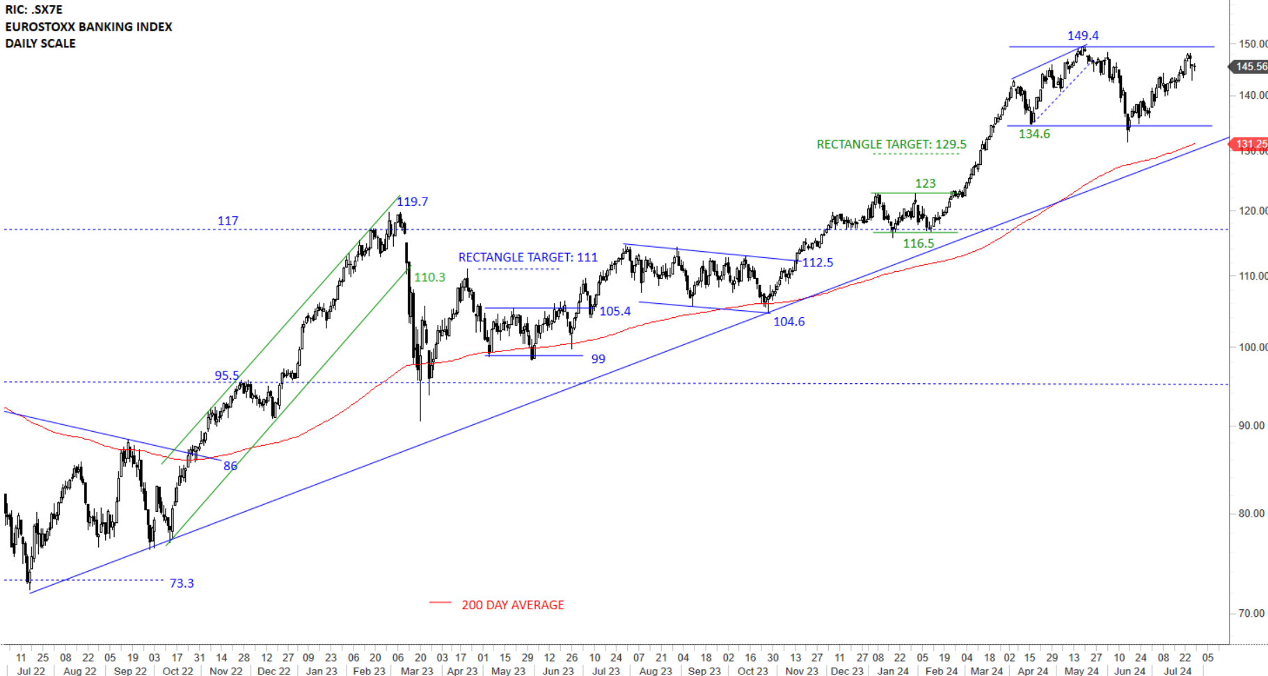 European Banking Index broke above 117-119.7 area which is positive for European banks in the long-term. Given the steep advance, it is possible that the index is now taking a breather and consolidating the gains of first half of the year. The long-term upward trend line from July 2022 lows is overlapping with the the 200-day average around the same level at 131.25 levels. Continued short-term strength helped the index test the resistance at 149.4 levels. A wide trading range might be forming between 134.6 and 149.4 levels.