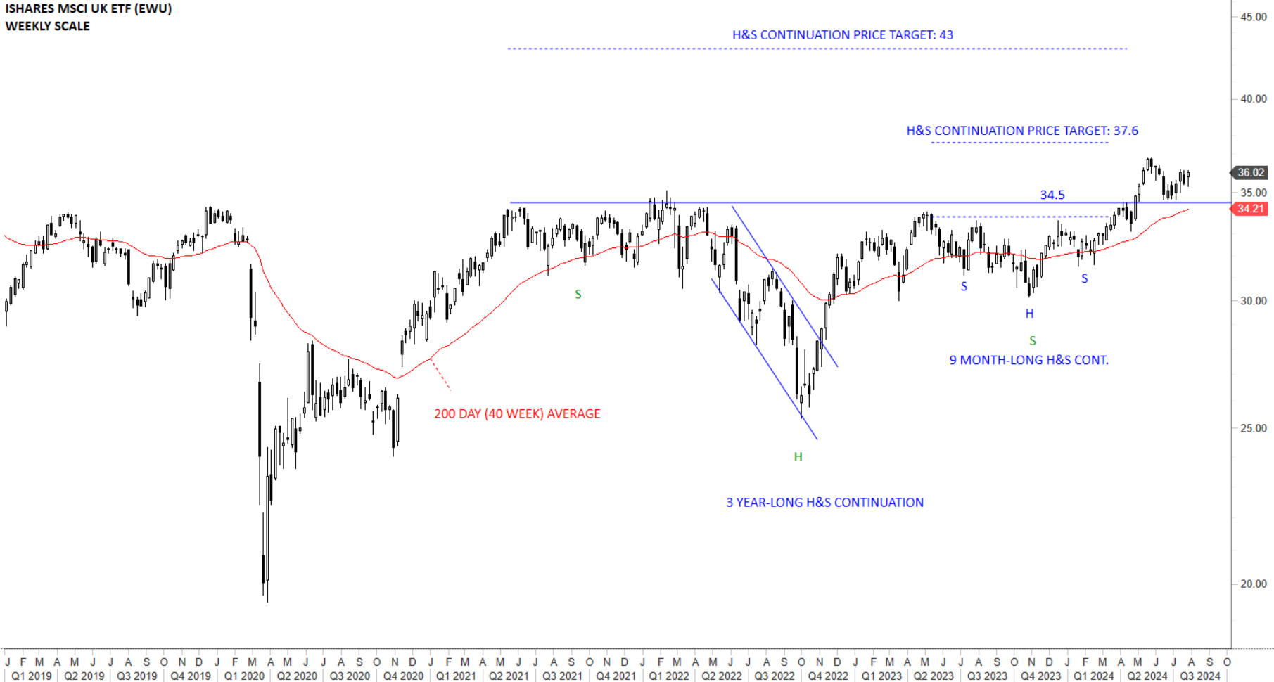 The Ishares MSCI UK ETF breached the 200-day average on the upside putting the price action in bullish territory. The horizontal boundary at 34.5 levels hasn’t been breached over the past 4 years and now this can be the strong breakout signal. I’m weighing the possibility of a long-term H&S continuation chart pattern completing with the breakout above 34.5 levels and also the right shoulder acting as a short-term H&S continuation. 2 different chart patterns might be completing around the same level. The neckline stood at 34.5 levels and already breached on the upside. There are two chart pattern price targets in focus. First one is at 37.6 levels and the second one is at 43 levels. During recent pullback 34.5 levels acted as support. A wider support area is between 34.21 and 34.5 levels.