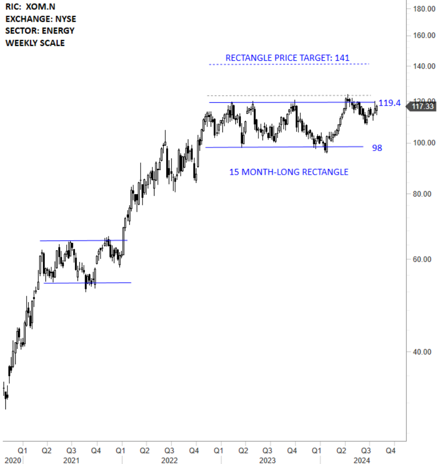 Exxon Mobil Corporation is an international energy and petrochemical company. The Company’s primary businesses include exploration for, and production of, crude oil and natural gas; manufacture, trade, transport and sale of crude oil, natural gas, petroleum products, petrochemicals, and a variety of specialty products; and pursuit of lower-emission business opportunities including carbon capture and storage, hydrogen, lower-emission fuels, and lithium. The stock is listed on the New York Stock Exchange. Price chart formed a 15 month-long rectangle with the horizontal boundary acting as strong resistance at 119.40 levels. The horizontal boundary was tested several times over the course of the chart pattern. A daily close above 123.00 levels will confirm the breakout from the 15 month-long rectangle with the possible chart pattern price target of 141.00 levels. (Learn more: Video Tutorial)