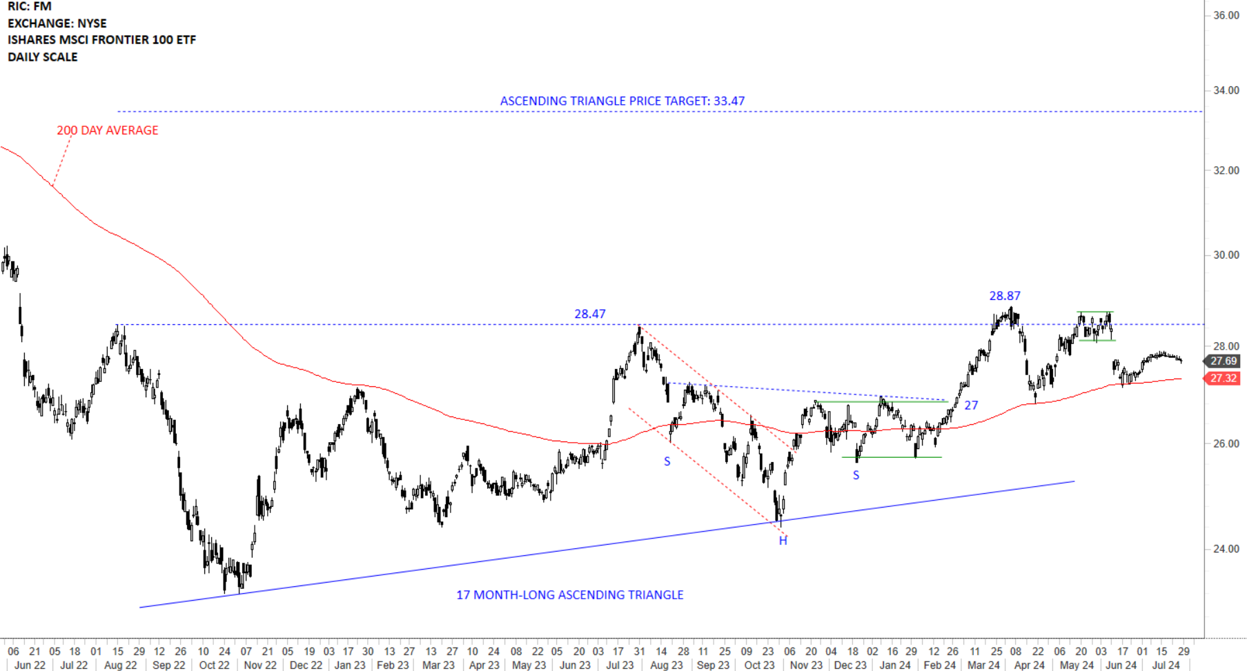 The benchmark for the Frontier equity markets performance, the iShares MSCI Frontier 100 ETF broke out of the possible H&S bottom reversal with the breach above the neckline at 27 levels. The ETF quickly reached the price target which acted as strong resistance at 28.47 levels. Previous resistance at 27 levels becomes the new support. A possible ascending triangle bottom reversal can complete with a breakout above 28.47 levels with the price target of 33.47 levels. Failure to hold above the 200-day average at 27.32 levels can result in extension of the sideways consolidation and possibly weakness towards the lower boundary of the ascending triangle at 25 levels.