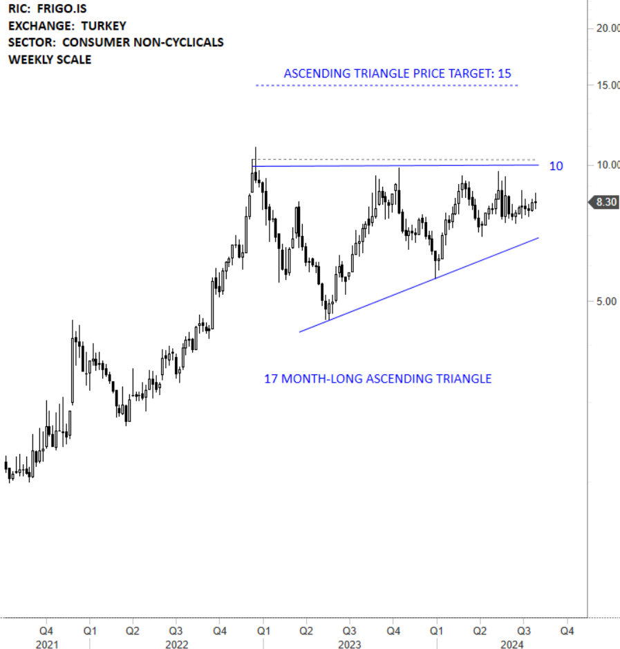 Frigo-Pak Gida Maddeleri Sanayi ve Ticaret AS is a Turkey-based company engaged in the production, processing and packaging of canned and frozen fruits and vegetables, carbonated drinks and fruit juices. The stock is listed on the Istanbul Stock Exchange. Price chart formed a 17 month-long ascending triangle with the horizontal boundary acting as strong resistance at 10.00 levels. The horizontal boundary was tested several times over the course of the chart pattern. A daily close above 10.30 levels will confirm the breakout from the 17 month-long ascending triangle with the possible chart pattern price target of 15.00 levels. (Learn more: Video Tutorial)