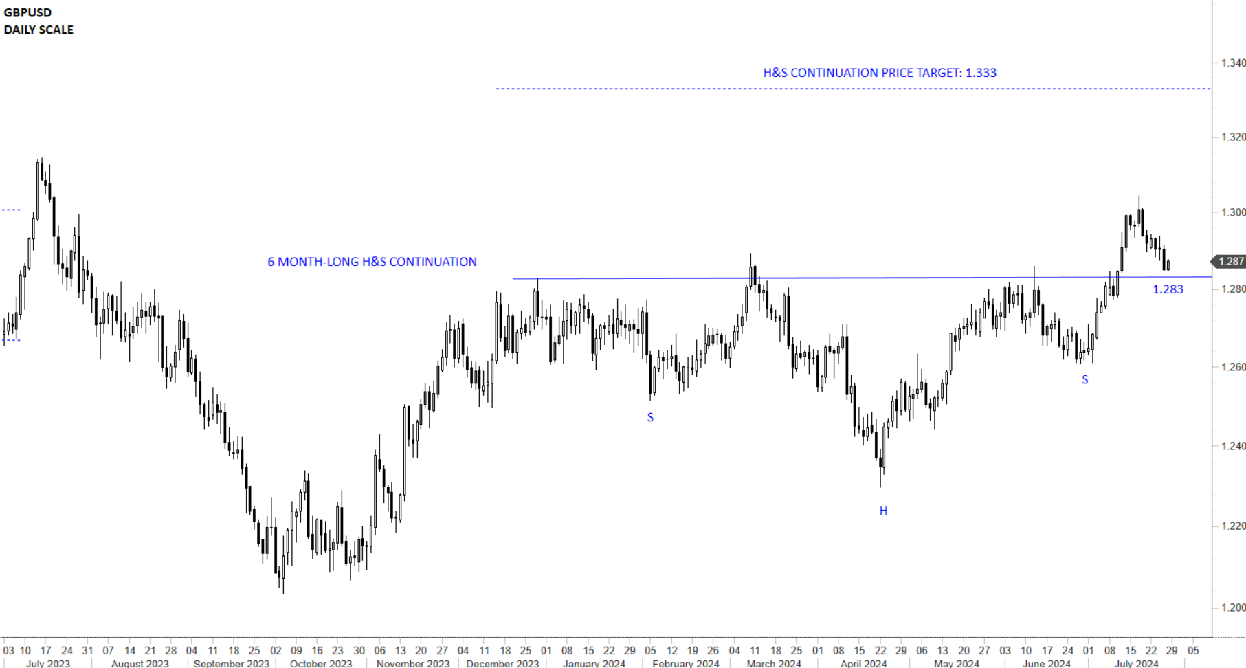 A text-book H&S continuation might be completing on GBPUSD with the lates breakout above the horizontal neckline at 1.283 levels. This week’s price action is possibly a re-test of the horizontal neckline which is now acting as short-term support. H&S continuation price target stands at 1.333 levels.