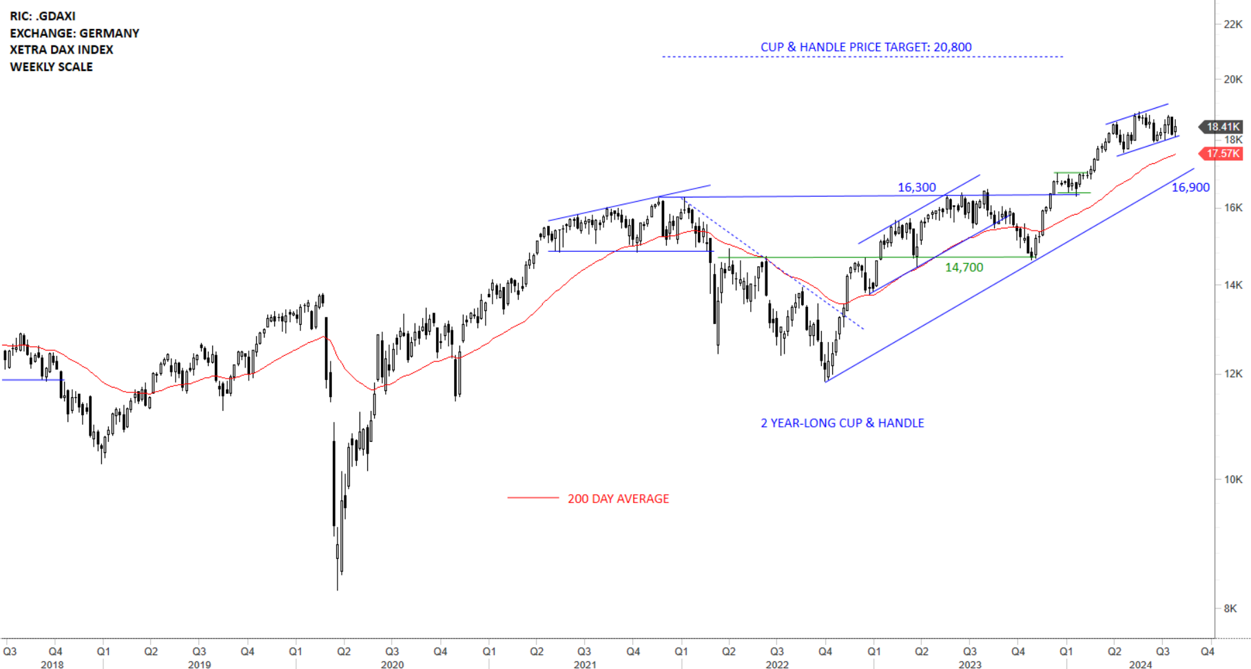 Germany’s XETRA Dax Index is trending above the 200-day average. The index possibly completed a 2 year-long cup & handle continuation that broke out to new all-time highs. Long-term cup & handle continuation price target stands at 20,800 levels. Strong support stands at 16,300 levels. As part of a reversion to the mean Dax can tests the 200-day average at 17,570 levels (possibility if market stalls at current levels).