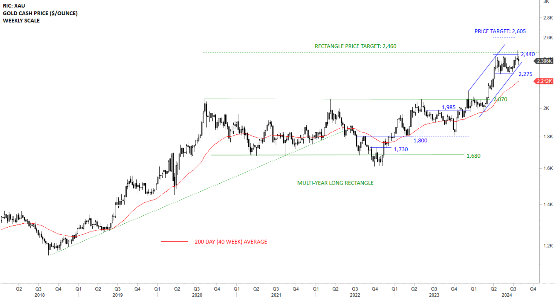 Breakout above 2,070 levels completed a multi-year long rectangle with the price target of 2,460 levels. Given that we are analyzing a monthly scale chart, March’s breakout was confirmed with a strong monthly close above the resistance. It is important to note that due to the length of the recent consolidation (multi-year long), breakout possibly started a multi-month long trend. Previous resistance at 2,070 levels becomes the new support. This month’s strength met the initial price target for the rectangle.