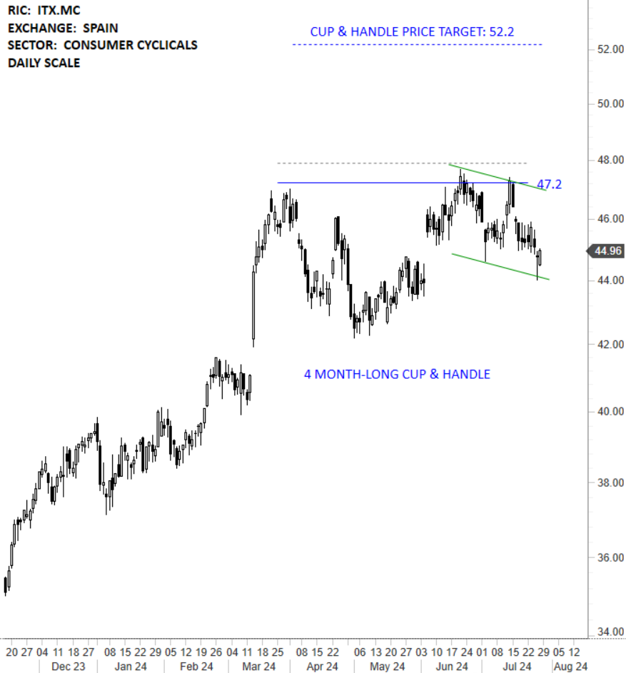 Industria de Diseno Textil SA, known as Inditex SA, is a Spain-based company primarily engaged in the textile industry. The Company’s activities include the design, confection, manufacturing, distribution and retail of men, women and children apparel, footwear and fashion accessories, as well as home furnishings and household textile products. The stock is listed on the Spain Stock Exchange. Price chart formed a 4 month-long cup & handle continuation with the horizontal boundary acting as strong resistance at 47.20 levels. The horizontal boundary was tested several times over the course of the chart pattern. A daily close above 47.90 levels will confirm the breakout from the 4 month-long cup & handle continuation with the possible chart pattern price target of 52.20 levels. (Learn more: Video Tutorial)
