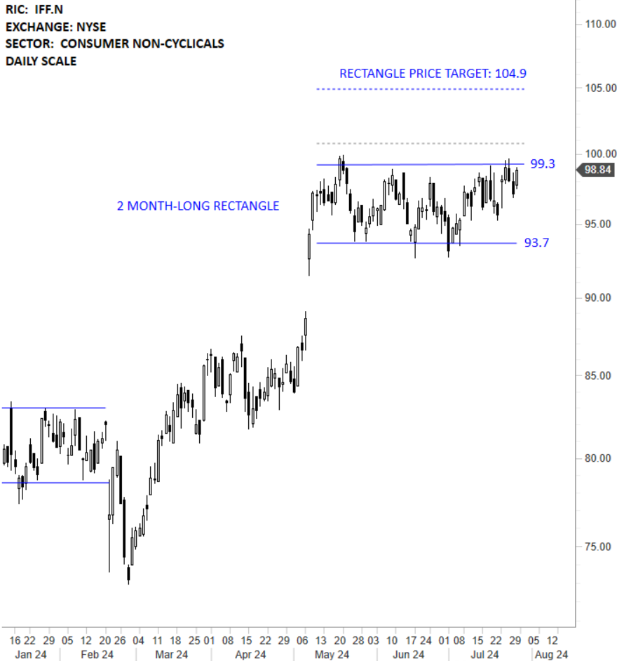 International Flavors & Fragrances Inc. is a creator and manufacturer of food, beverage, health and biosciences, scent and pharma solutions, and complementary adjacent products. The stock is listed on the New York Stock Exchange. Price chart formed a 2 month-long rectangle with the horizontal boundary acting as strong resistance at 99.30 levels. The horizontal boundary was tested several times over the course of the chart pattern. A daily close above 100.80 levels will confirm the breakout from the 2 month-long rectangle with the possible chart pattern price target of 104.90 levels. (Learn more: Video Tutorial)