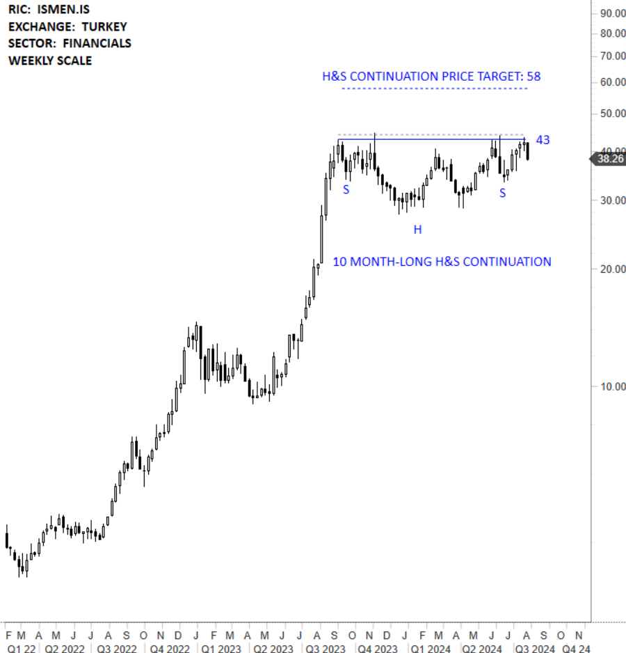 Is Yatirim Menkul Degerler AS (Is Yatirim) is a Turkey-based brokerage house established by Turkiye Is Bankasi to provide investment advisory services. The stock is listed on the Istanbul Stock Exchange. Price chart formed a 10 month-long head and shoulder continuation with the horizontal boundary acting as strong resistance at 43.00 levels. The horizontal boundary was tested several times over the course of the chart pattern. A daily close above 44.20 levels will confirm the breakout from the 10 month-long head and shoulder continuation with the possible chart pattern price target of 58.00 levels. (Learn more: Video Tutorial)