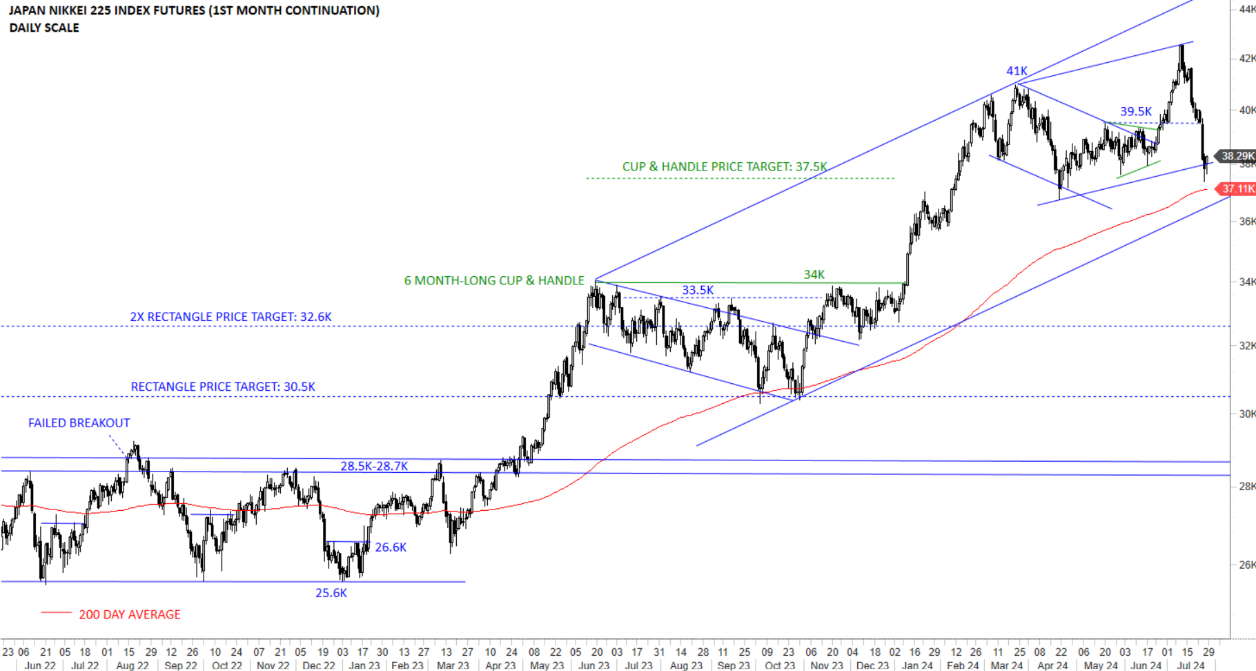 Japan’s NIKKEI 225 index completed a 6 month-long cup with handle continuation and met its price target at 37.5K. Since March the index has been consolidating in a wide range between 41K and the 200-day average at 37K. Uptrend is intact with price remaining above the year-long average and inside the upward trend channel. In fact the index might be close to an inflection point formed by strong support levels.