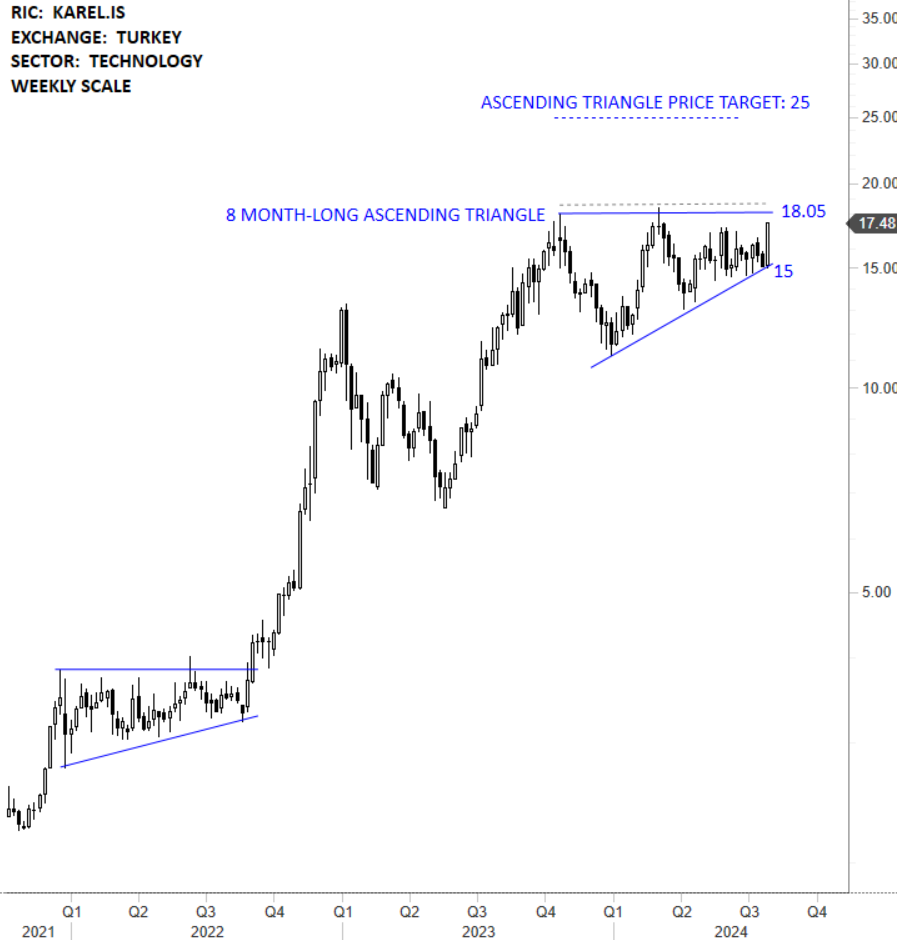 Karel Elektronik Sanayi ve Ticaret AS is a Turkey-based telecommunication equipment manufacturer and supplier. The Company’s core business is the design, development, production and marketing of all kinds of telephone systems, including public switches and private branch exchange (PBX) systems with telephone sets, electronic circuit boards and other accessories. The stock is listed on the Istanbul Stock Exchange. Price chart formed an 8 month-long ascending triangle with the horizontal boundary acting as strong resistance at 18.05 levels. The horizontal boundary was tested several times over the course of the chart pattern. A daily close above 18.60 levels will confirm the breakout from the 8 month-long ascending triangle with the possible chart pattern price target of 25.00 levels. (Learn more: Video Tutorial)