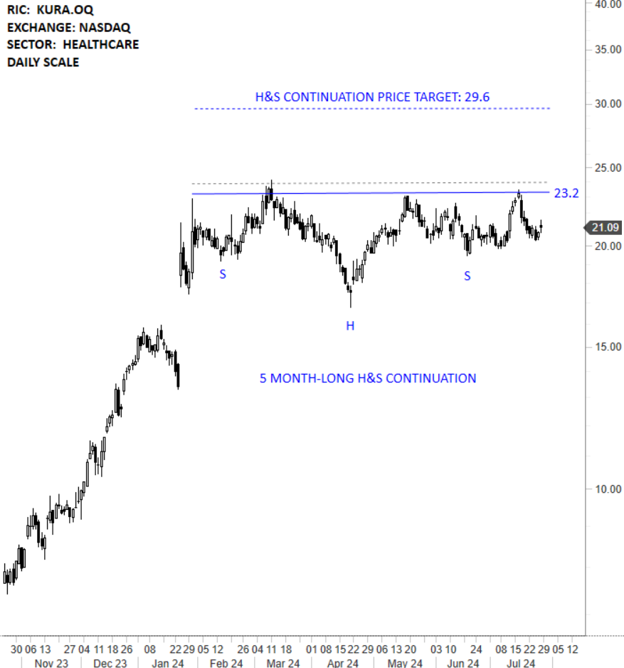 Kura Oncology, Inc. is a clinical-stage biopharmaceutical company. The Company is focused on precision medicine for the treatment of cancer. The stock is listed on the Nasdaq Stock Exchange. Price chart formed a 5 month-long head and shoulder continuation with the horizontal boundary acting as strong resistance at 23.20 levels. The horizontal boundary was tested several times over the course of the chart pattern. A daily close above 23.90 levels will confirm the breakout from the 5 month-long head and shoulder continuation with the possible chart pattern price target of 29.60 levels. (Learn more: Video Tutorial)