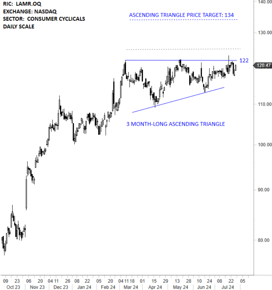 Lamar Advertising Company is an outdoor advertising company. The Company rents space for advertising on billboards, buses, shelters, benches, logo plates and in airport terminals. The stock is listed on the Nasdaq Stock Exchange. Price chart formed a 3 month-long ascending triangle with the horizontal boundary acting as strong resistance at 122.00 levels. The horizontal boundary was tested several times over the course of the chart pattern. A daily close above 125.00 levels will confirm the breakout from the 3 month-long ascending triangle with the possible chart pattern price target of 134.00 levels. (Learn more: Video Tutorial)
