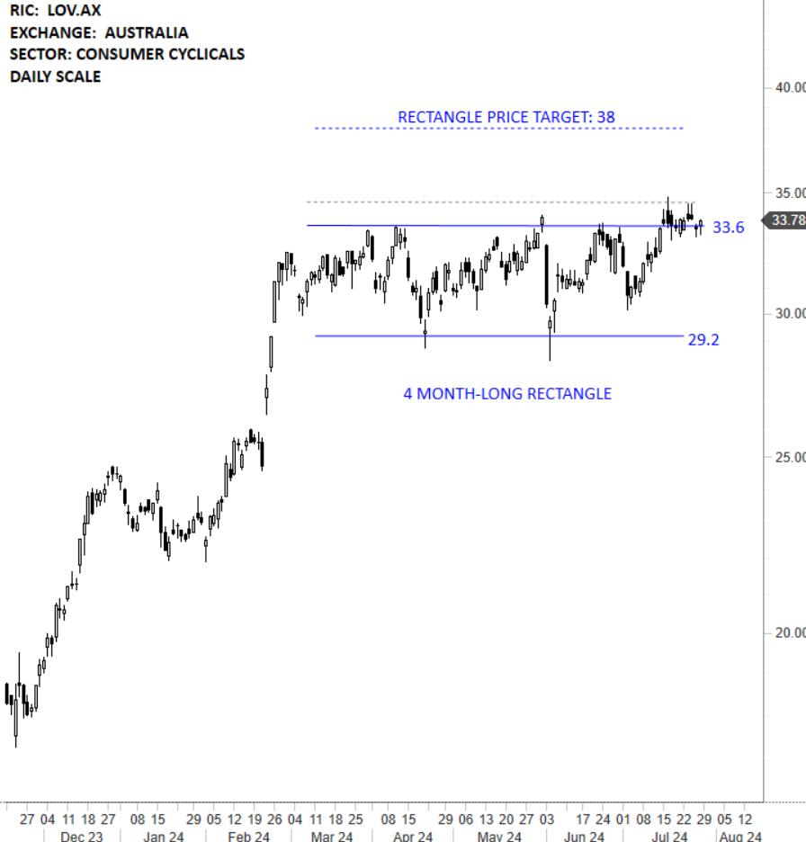Lovisa Holdings Limited is an Australia-based specialist fast fashion jewelry retailer. The Company and its subsidiaries are primarily involved in the retail sale of fashion jewelry and accessories. The stock is listed on the Sydney Stock Exchange. Price chart formed a 4 month-long rectangle with the horizontal boundary acting as strong resistance at 33.60 levels. The horizontal boundary was tested several times over the course of the chart pattern. A daily close above 34.60 levels will confirm the breakout from the 4 month-long rectangle with the possible chart pattern price target of 38.00 levels. (Learn more: Video Tutorial)