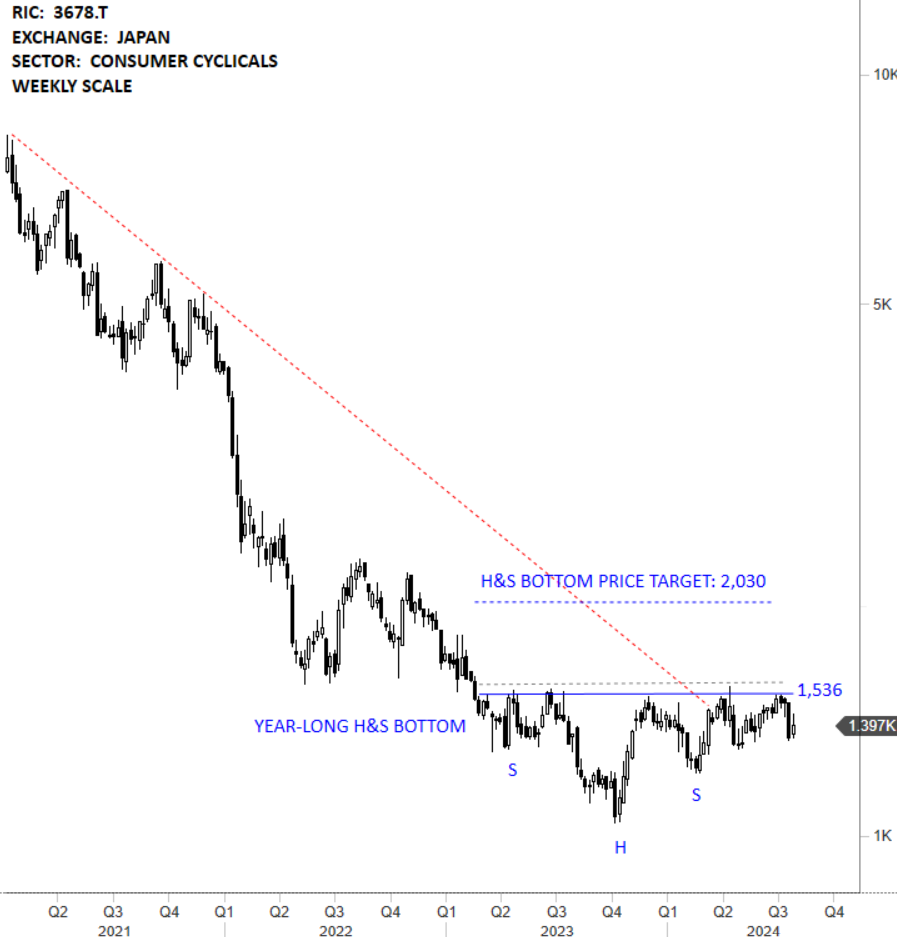 Media Do Co Ltd, formerly known as Media Do Holdings Co Ltd is a Japan-based company mainly engaged in the distribution of electronic books (e-books) mainly for smartphones, tablet terminals and other mobile terminals. The stock is listed on the Tokyo Stock Exchange. Price chart formed a 12 month-long head and shoulder bottom with the horizontal boundary acting as strong resistance at 1,536.00 levels. The horizontal boundary was tested several times over the course of the chart pattern. A daily close above 1,582.00 levels will confirm the breakout from the 12 month-long head and shoulder bottom with the possible chart pattern price target of 2,030.00 levels. (Learn more: Video Tutorial)