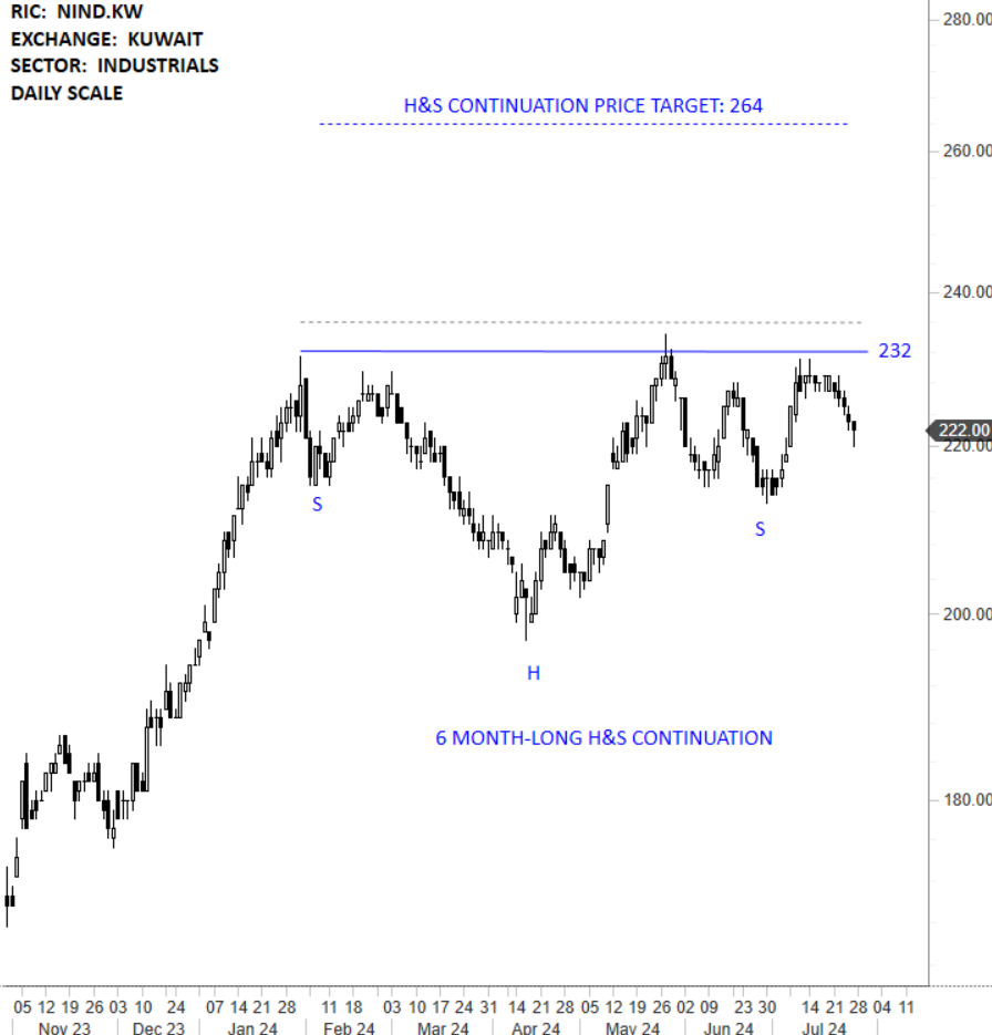 National Industries Group Holding KPSC is a Kuwait-based company engaged in diversified industrial sectors. The Company operates, along with its subsidiaries, in three business segments: Investment, Building materials and Specialist engineering. The stock is listed on the Kuwait Stock Exchange. Price chart formed a 6 month-long head and shoulder continuation with the horizontal boundary acting as strong resistance at 232.00 levels. The horizontal boundary was tested several times over the course of the chart pattern. A daily close above 236.00 levels will confirm the breakout from the 6 month-long head and shoulder continuation with the possible chart pattern price target of 264.00 levels. (Learn more: Video Tutorial)