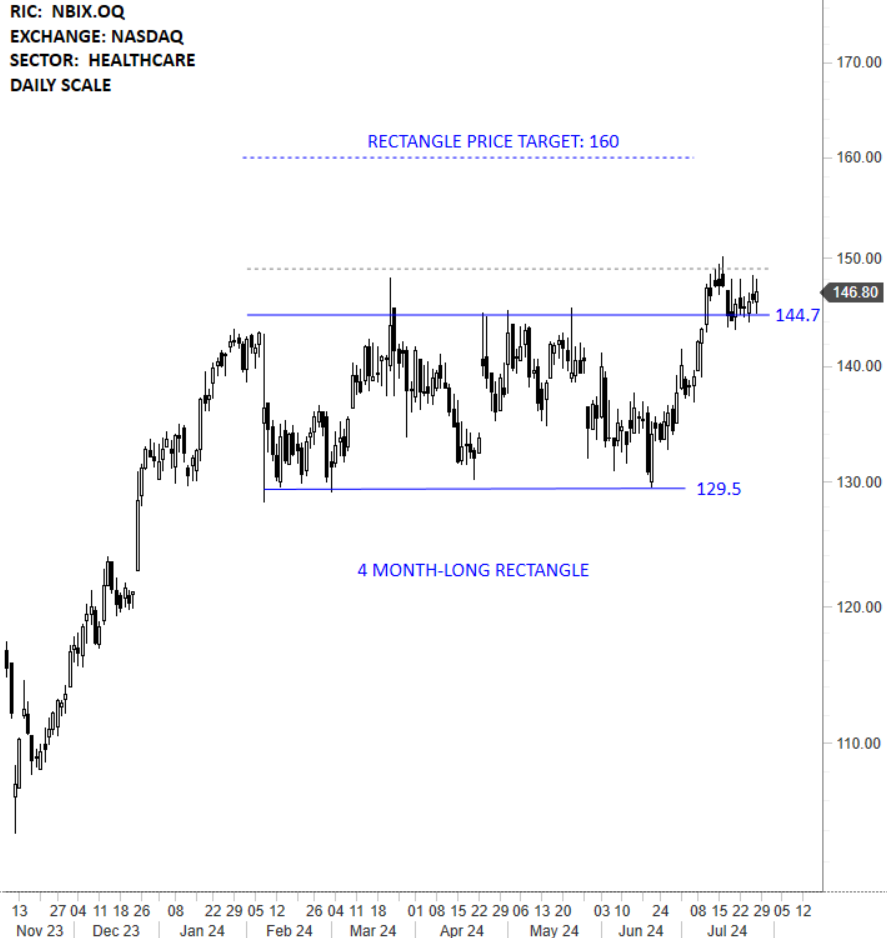 Neurocrine Biosciences, Inc. is a neuroscience-focused, biopharmaceutical company. The Company is engaged in discovering and developing treatments for patients with under-addressed neurological, neuroendocrine and neuropsychiatric disorders. The stock is listed on the Nasdaq Stock Exchange. Price chart formed a 4 month-long rectangle with the horizontal boundary acting as strong resistance at 144.70 levels. The horizontal boundary was tested several times over the course of the chart pattern. A daily close above 149.00 levels will confirm the breakout from the 4 month-long rectangle with the possible chart pattern price target of 160.00 levels. (Learn more: Video Tutorial)