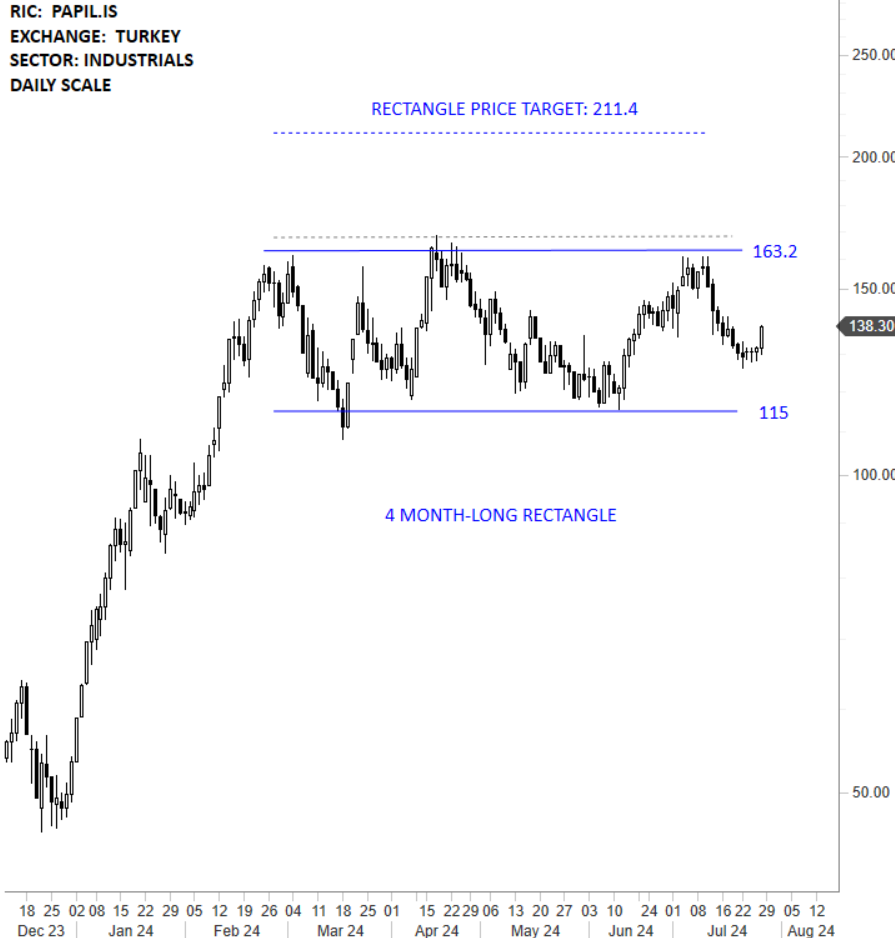 Papilon Savunma Teknoloji ve Ticaret AS is a Turkey-based company, which provides security technology services and products. The Company develops and manufactures biometric identification devices, artificial intelligence (AI) backed security systems, and related software for governments, law enforcement agencies, and private companies. The stock is listed on the Istanbul Stock Exchange. Price chart formed a 4 month-long rectangle with the horizontal boundary acting as strong resistance at 163.20 levels. The horizontal boundary was tested several times over the course of the chart pattern. A daily close above 168.00 levels will confirm the breakout from the 4 month-long rectangle with the possible chart pattern price target of 211.40 levels. (Learn more: Video Tutorial)