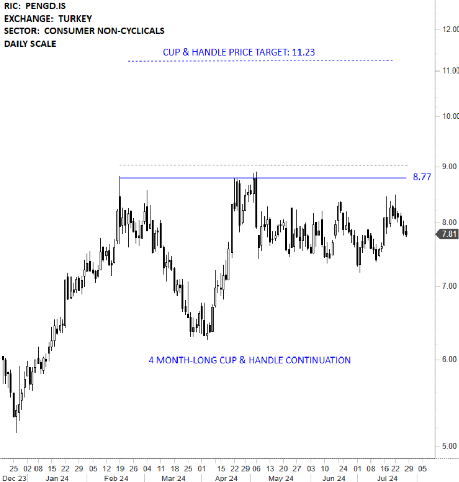 Penguen Gida Sanayi AS is a Turkey-based food manufacturing company. The stock is listed on the Istanbul Stock Exchange. Price chart formed a 4 month-long cup & handle continuation with the horizontal boundary acting as strong resistance at 8.77 levels. The horizontal boundary was tested several times over the course of the chart pattern. A daily close above 9.03 levels will confirm the breakout from the 4 month-long cup & handle continuation with the possible chart pattern price target of 11.23 levels. (Learn more: Video Tutorial)