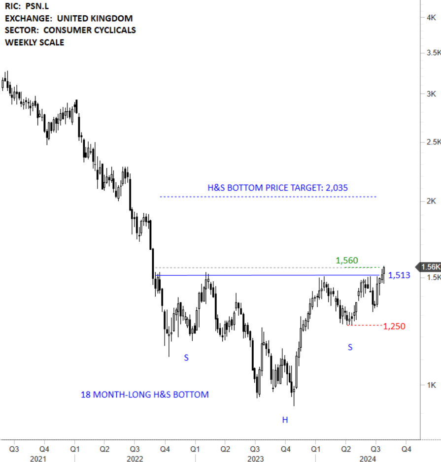 Persimmon Plc is a United Kingdom-based housebuilder serving local markets with 30 offices across the country and three off-site manufacturing facilities. The Company operates from 30 regional offices throughout the United Kingdom, trading under the brand names of Persimmon Homes, Charles Church, and Westbury Partnerships. The stock is listed on the London Stock Exchange. Price chart formed an 18 month-long head and shoulder bottom with the horizontal boundary acting as strong resistance at 1,513.00 levels. The horizontal boundary was tested several times over the course of the chart pattern. The daily close above 1,558.00 levels confirmed the breakout from the 18 month-long head and shoulder bottom with the possible chart pattern price target of 2,035.00 levels. (Learn more: Video Tutorial)