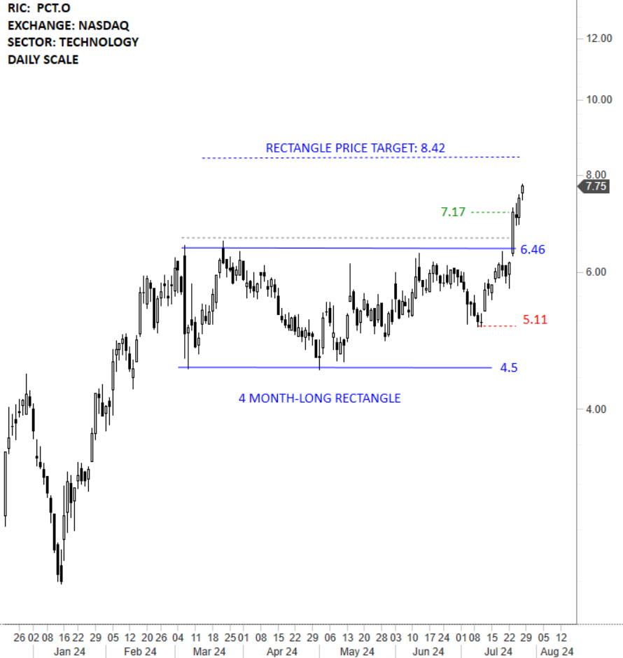 PureCycle Technologies, Inc. is commercializing a patented purification recycling technology (the Technology), originally developed by The Procter & Gamble Company, for restoring waste polypropylene into resin with near-virgin characteristics, called ultra-pure recycled (UPR) resin. The stock is listed on the Nasdaq Stock Exchange. Price chart formed a 4 month-long rectangle with the horizontal boundary acting as strong resistance at 6.46 levels. The horizontal boundary was tested several times over the course of the chart pattern. The daily close above 6.65 levels confirmed the breakout from the 4 month-long rectangle with the possible chart pattern price target of 8.42 levels. (Learn more: Video Tutorial)