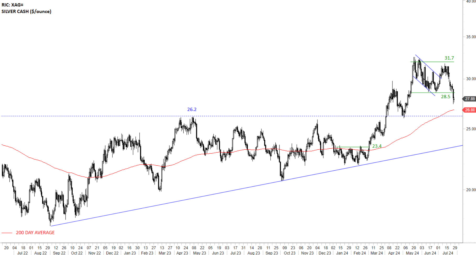 Silver has been the most volatile and with the most frequent false signals between the metals that were discussed in the report. Previous resistance at 26.2 levels becomes the new long-term support which is also overlapping with the 200-day average around 26.78 levels. Price target for the H&S bottom stands at 34.6 levels. Recent sharp correction is targeting the year-log average as part of a reversion to the mean. Uptrend is intact.
