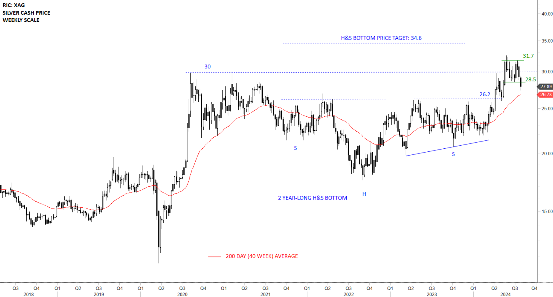 Below is the daily scale price chart of Silver. Breakout above 26.2 levels confirmed not only the H&S bottom reversal but also the right shoulder as an ascending triangle. The chart is showing an uptrend with higher highs and higher lows. Minor low at 28.5 can act as short-term support once again. A possible short-term consolidation can form between 28.5 and 31.7 levels. Breakdown below 28.5 levels can push price lower towards the 200-day average at 26.7 levels.