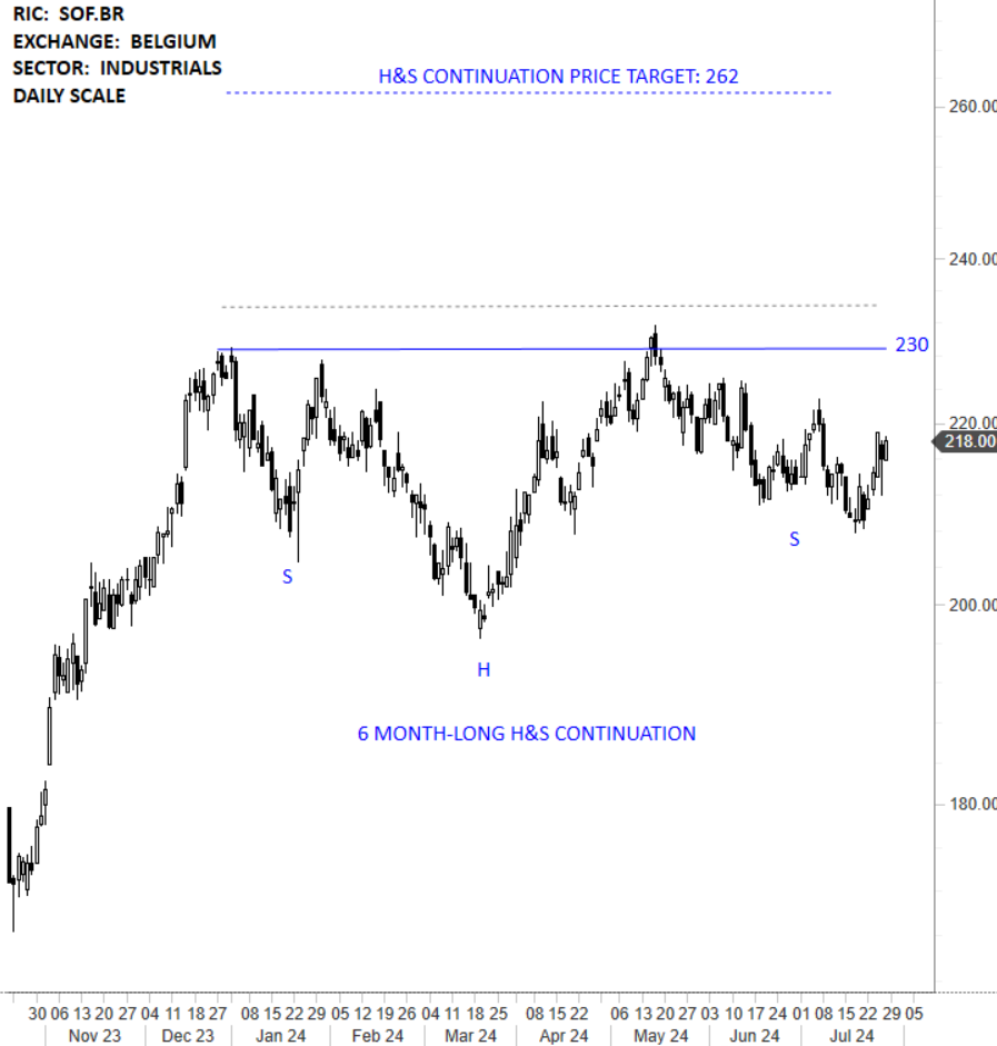 Sofina SA is a Belgium-based holding company that invests, directly and indirectly, in companies from various sectors. In the sector of Energy & Services the Company has interest in GDF Suez, International Power, Exmar, bioMerieux, Suez Environnement. The stock is listed on the Belgium Stock Exchange. Price chart formed a 6 month-long head and shoulder continuation with the horizontal boundary acting as strong resistance at 230.00 levels. The horizontal boundary was tested several times over the course of the chart pattern. A daily close above 234.00 levels will confirm the breakout from the 6 month-long head and shoulder continuation with the possible chart pattern price target of 262.00 levels. (Learn more: Video Tutorial)
