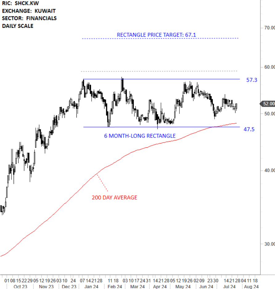 Sokouk Holding Co KSCP, formerly Sokouk Holding Co KSCC, is a Kuwait-based company engaged in the investment activities in accordance with Islamic shariah principles. The stock is listed on the Kuwait Stock Exchange. Price chart formed a 6 month-long rectangle with the horizontal boundary acting as strong resistance at 57.30 levels. The horizontal boundary was tested several times over the course of the chart pattern. A daily close above 59.00 levels will confirm the breakout from the 6 month-long rectangle with the possible chart pattern price target of 67.10 levels. (Learn more: Video Tutorial)