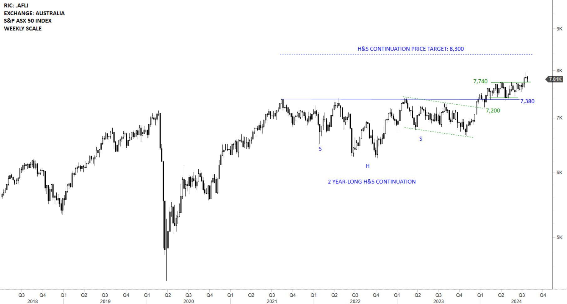 Australia S&P ASX 50 Index cleared the strong horizontal the resistance at 7,380 levels. Strong price action puts the H&S continuation possibility on the cards. H&S continuation price target stands at 8,300 levels. 7,200-7,380 area was tested as support. Last few week’s price action was possibly a re-test of the support area. Uptrend can resume. Breakout above 7,740 levels completed the short-term rectangle consolidation and and can resume the existing uptrend. Previous resistance at 7,740 levels becomes the short-term support.