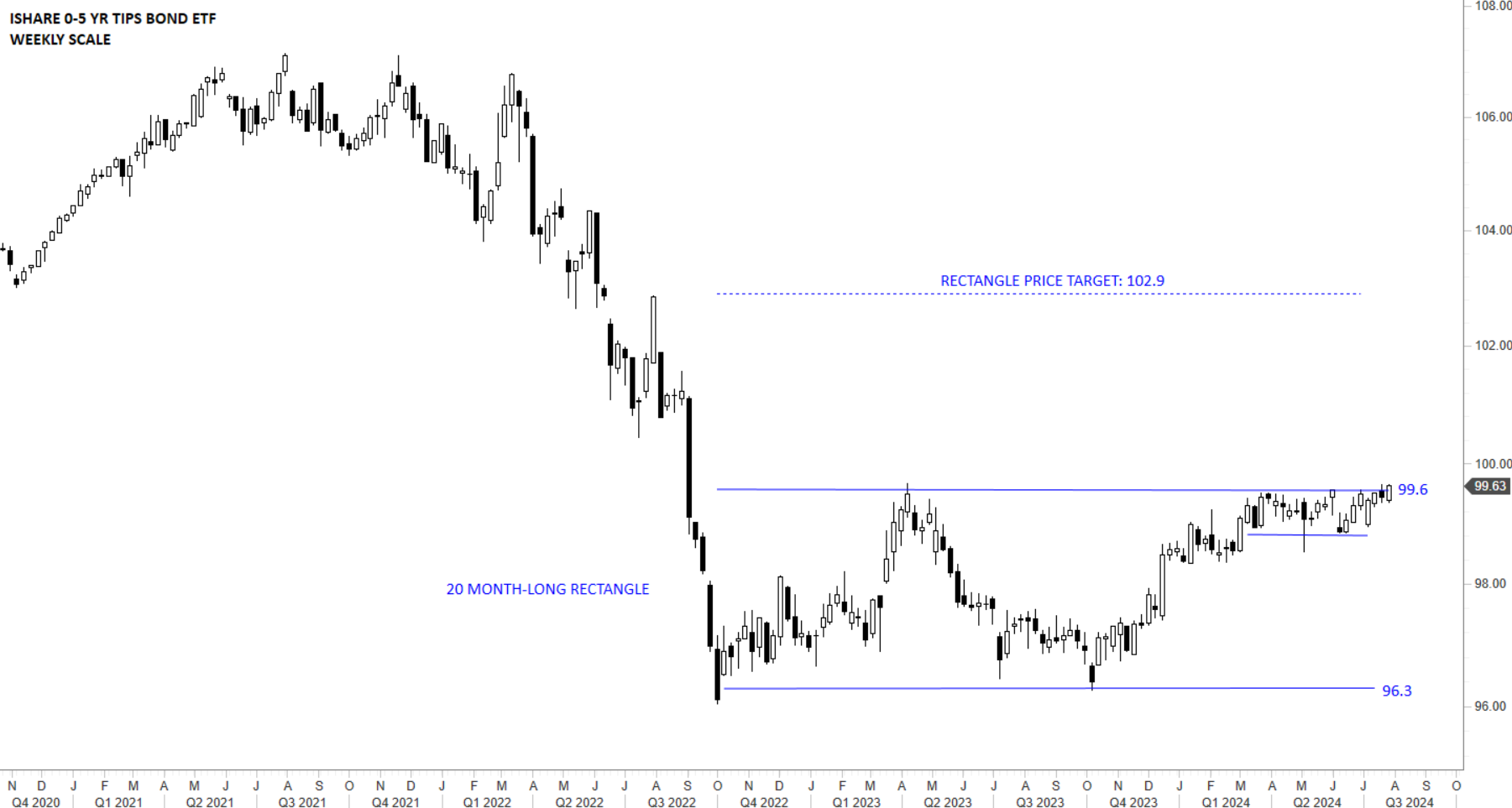 The I-SHARE 0-5 YR TIPS BOND ETF seeks to track the investment results of an index composed of inflation-protected U.S. Treasury bonds with remaining maturities of less than five years. It seeks to protect against near-term inflation. Price chart formed a 20 month-long rectangle with the upper boundary acting as resistance at 99.6 levels. Last 3 month’s consolidation right below the resistance can be a preparation for a breakout higher. Breakout can confirm the rectangle as bottom reversal with the price target of 102.9 levels.