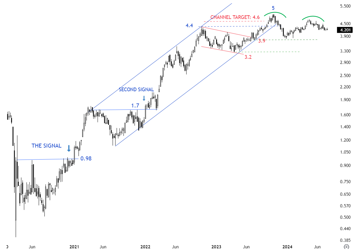 De Grey Mining Limited is an Australia-based gold explorer and project development company. The Company is focused on the Mallina Gold Project in the Pilbara region of Western Australia. The stock is listed on the Sydney Stock Exchange. Price chart formed a 24 month-long rectangle with the horizontal boundary acting as strong resistance at 1.65 levels. The horizontal boundary was tested several times over the course of the chart pattern. A daily close above 1.75 levels will confirm the breakout from the 24 month-long rectangle with the possible chart pattern price target of 2.50 levels. (Learn more: Video Tutorial)